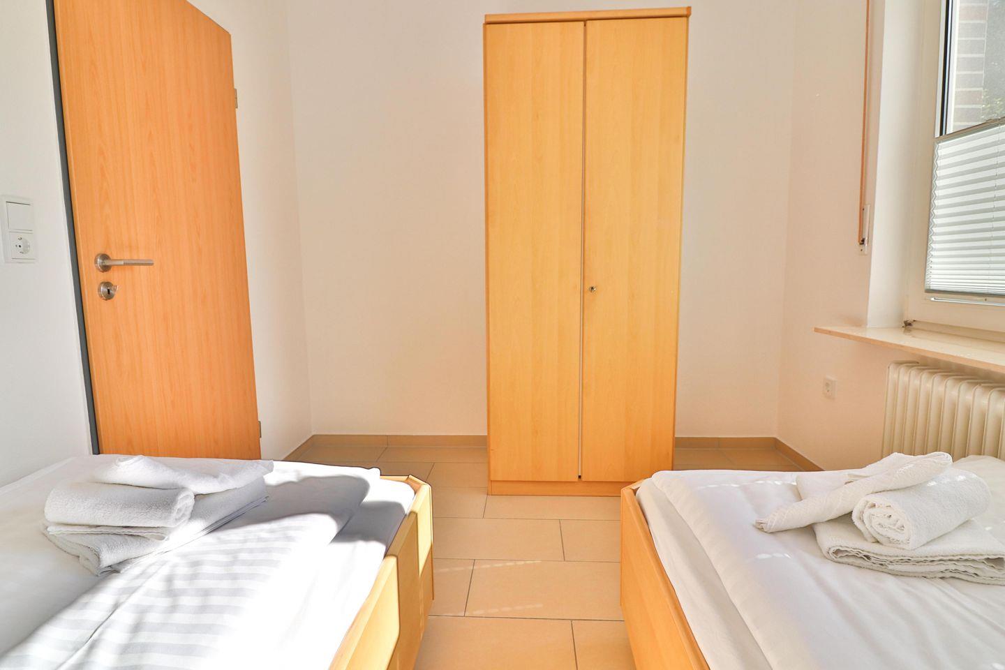 Die Wohnung verfügt über ein Hauptschlafzimmer mit einem komfortablen Doppelbett der Größe 180×200 cm, einem großen Kleiderschrank und einem Eckregal sowie praktischen USB-Steckdosen mit Leuchtfunktion zum einfachen Aufladen elektronischer Geräte. Das zweite Schlafzimmer ist mit zwei Einzelbetten der Größe 90×200 cm ausgestattet. Hier steht Ihnen ebenfalls ein Kleiderschrank zur Verfügung, um Ihre persönlichen Gegenstände unterzubringen. Auch in diesem Zimmer finden Sie praktische USB-Steckdosen mit Leuchtfunktion.