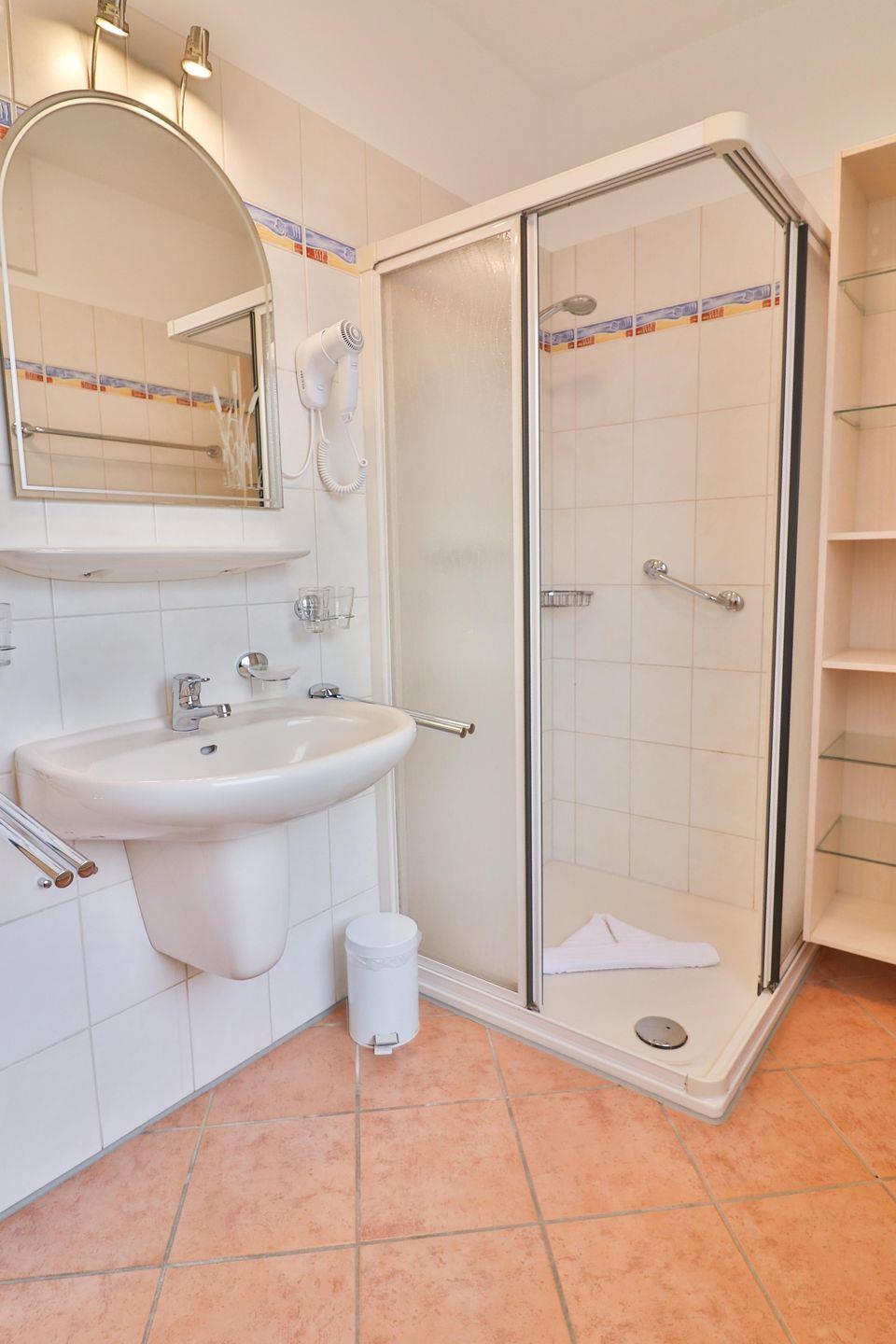 Das große Badezimmer bietet eine Dusche, ein Waschbecken sowie ein WC. Hier finden Sie außerdem Kleiderhaken und ein zusätzliches Wandregal für Ihre persönlichen Utensilien. Auch ein Haartrockner ist hier vorhanden.