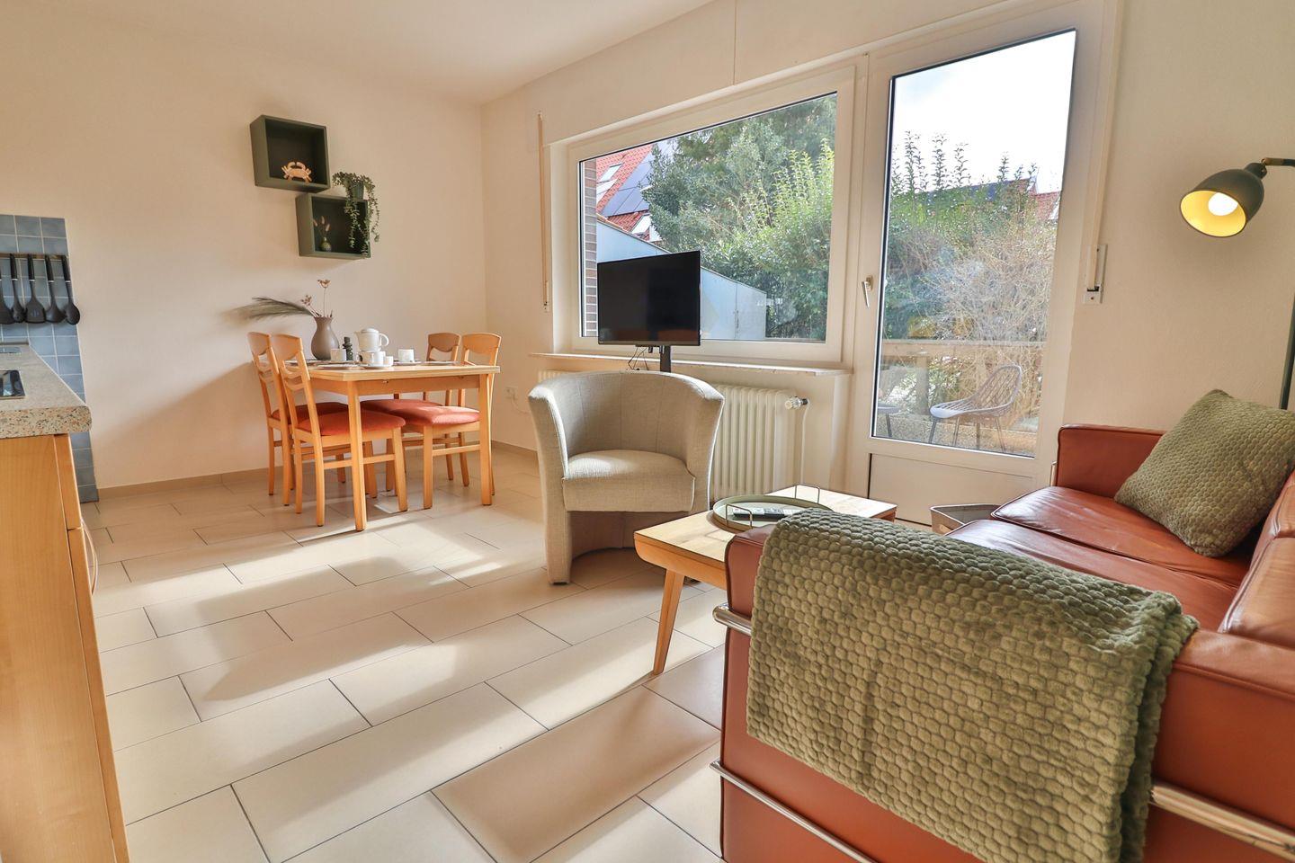 Die lichtdurchflutete Wohnung 1 im Erdgeschoss des Hauses „Libelle“ ist perfekt für bis zu vier Personen geeignet. Auf einer Fläche von 58 qm finden Sie alles, was Sie für Ihren Wohlfühl-Urlaub benötigen. Die Wohnung wurde im Frühjahr 2025 teilweise renoviert.
