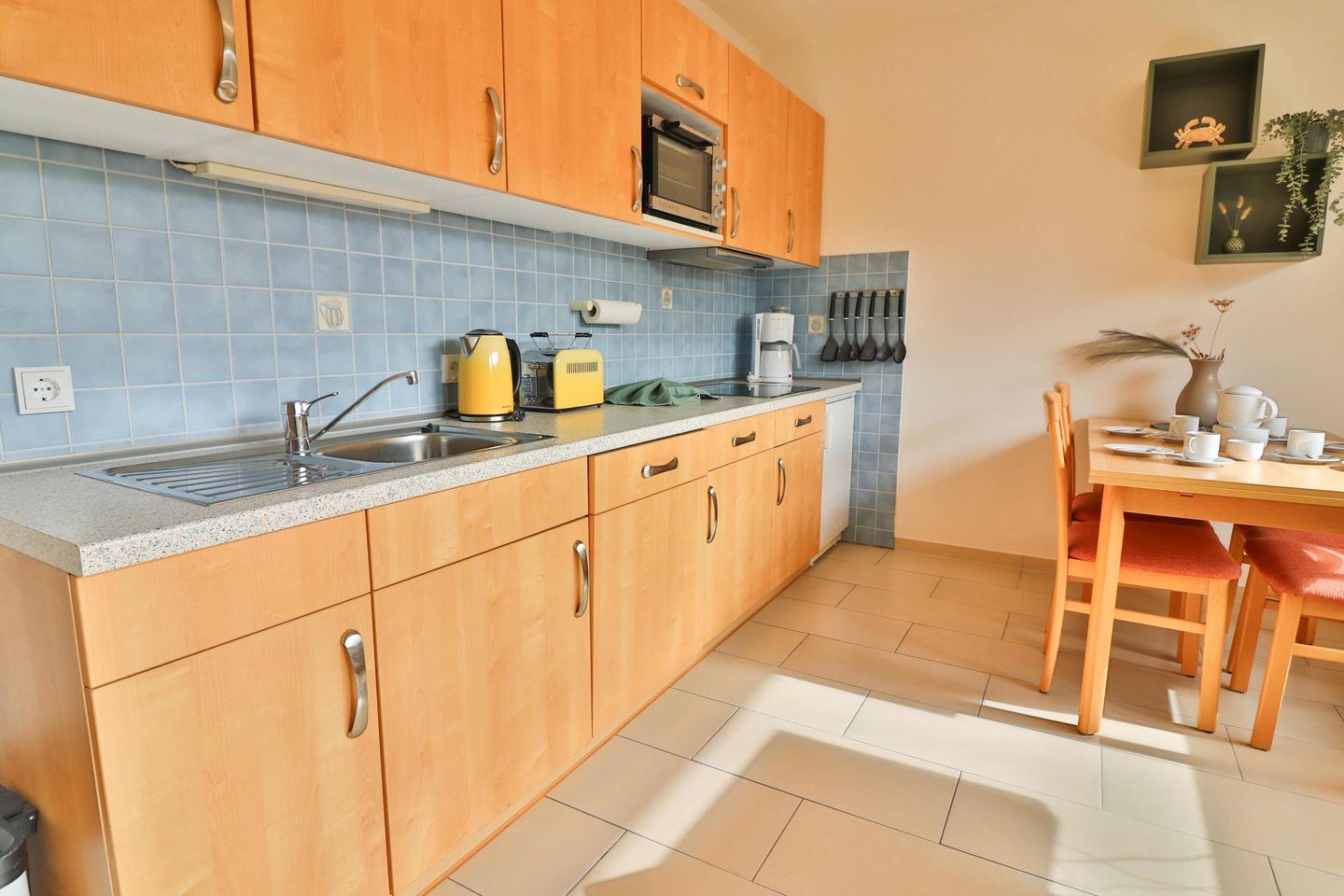 Die helle Wohnküche mit Zugang zur großen, nahezu uneinsehbaren Terrasse bietet neben einem bequemen Sofa und einem Cocktailsessel, auf denen Sie sich entspannen können, einen Esstisch sowie eine Küchenzeile, die reichlich Platz bietet, um ein leckeres Essen zu zaubern. Das 4-Platten-Ceranfeld mit Dunstabzug ermöglicht Ihnen bequemes Kochen. In der Küche finden Sie außerdem ein großes Spülbecken, einen kleinen, erhöhten Backofen, eine Spülmaschine, einen Kühlschrank mit integriertem Gefrierfach, eine Filterkaffeemaschine, einen Toaster und einen Wasserkocher. Neben diversen Küchenutensilien und einer großen Auswahl an Geschirr finden Sie darüber hinaus Teegeschirr, um entspannte Urlaubstage bei einer Tasse Ostfriesentee ausklingen zu lassen. Zu Ihrer Unterhaltung dient in diesem Raum der variabel drehbare Fernseher.