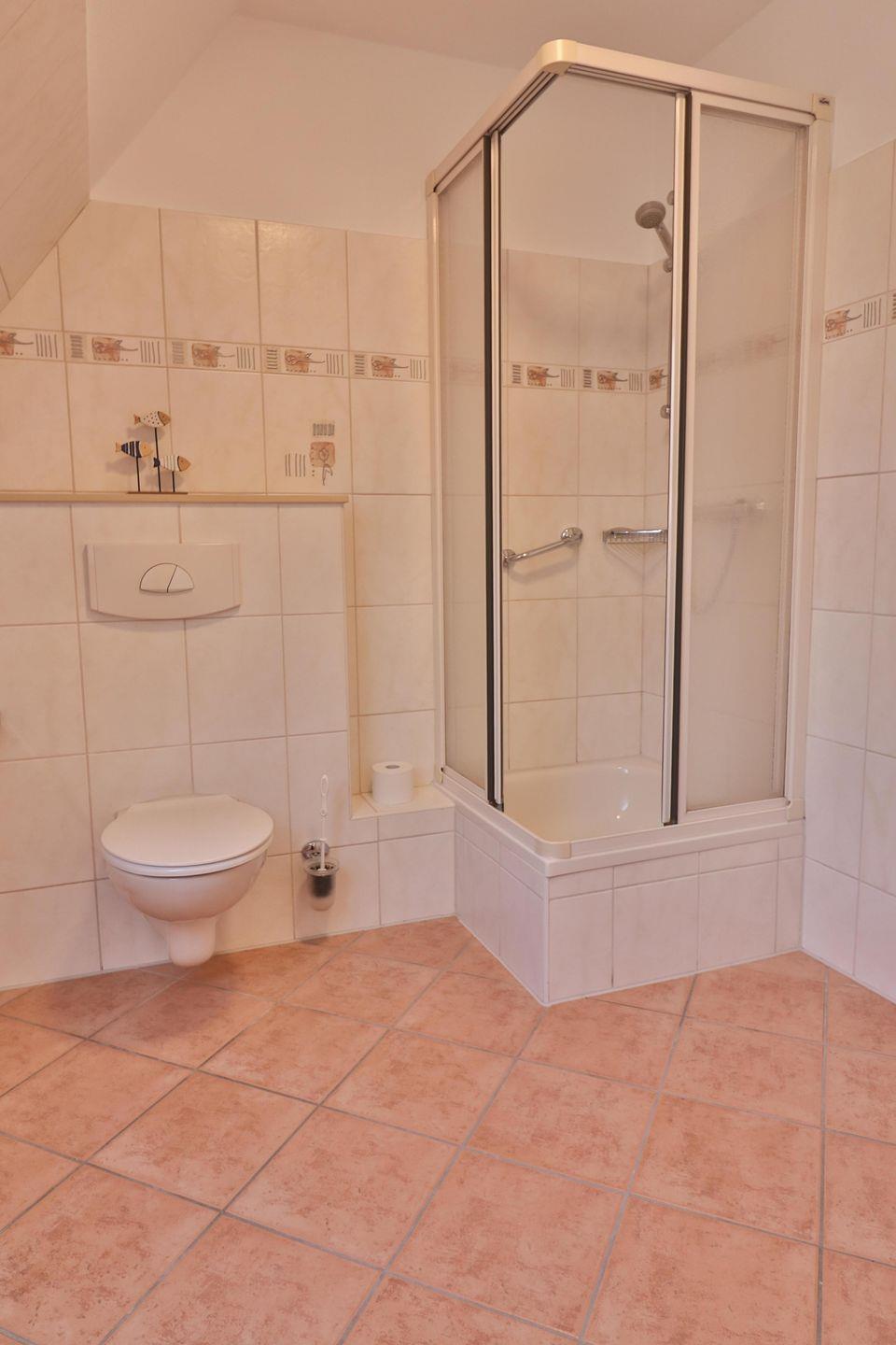 Das geräumige Badezimmer bietet eine Dusche, ein Waschbecken sowie ein WC. Hier finden Sie außerdem Kleiderhaken und ein zusätzliches Wandregal für Ihre persönlichen Utensilien. Auch ein Haartrockner ist hier vorhanden.