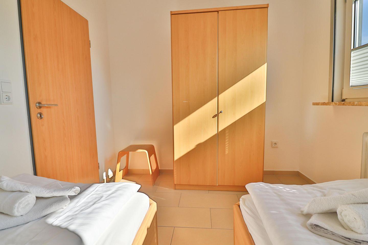 Diese Ferienwohnung verfügt über ein Hauptschlafzimmer mit einem komfortablen Doppelbett der Größe 180×200 cm, einem großen Kleiderschrank und praktischen USB-Steckdosen mit Leuchtfunktion zum einfachen Aufladen elektronischer Geräte. Das zweite Schlafzimmer ist mit zwei Einzelbetten der Größe 90×200 cm ausgestattet. Auch in diesem Zimmer steht Ihnen ein Kleiderschrank für Ihre persönlichen Gegenstände zur Verfügung sowie USB-Steckdosen mit Leuchtfunktion.