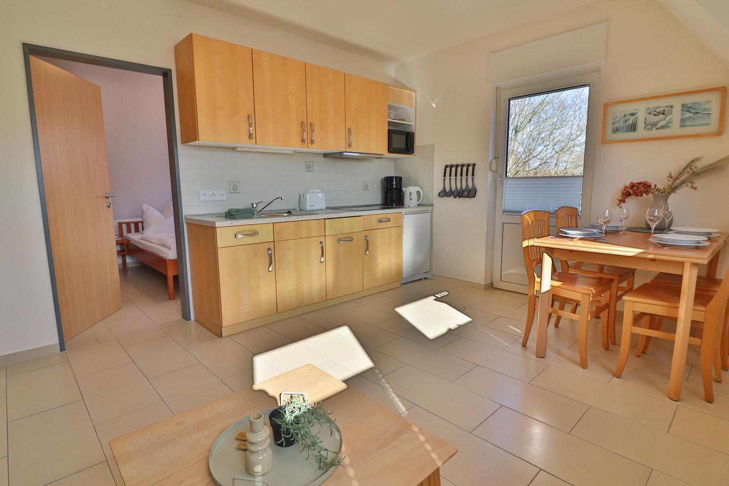 Die helle Wohnküche mit Zugang zum Balkon bietet neben einem bequemen Sofa und einem Cocktailsessel, auf denen Sie sich entspannen können, einen Esstisch sowie eine Küchenzeile, die reichlich Platz bietet, um ein leckeres Essen zu zaubern. Das 4-Platten-Ceranfeld mit Dunstabzug ermöglicht Ihnen bequemes Kochen. In der Küche finden Sie außerdem ein großes Spülbecken, eine Mikrowelle, eine Spülmaschine, einen Kühlschrank, eine Filterkaffeemaschine, einen Toaster und einen Wasserkocher. Neben diversen Küchenutensilien und einer großen Auswahl an Geschirr steht Ihnen darüber hinaus Teegeschirr zur Verfügung, um entspannte Urlaubstage bei einer Tasse Ostfriesentee ausklingen zu lassen. Zu Ihrer Unterhaltung dient in diesem Raum der variabel drehbare Fernseher.