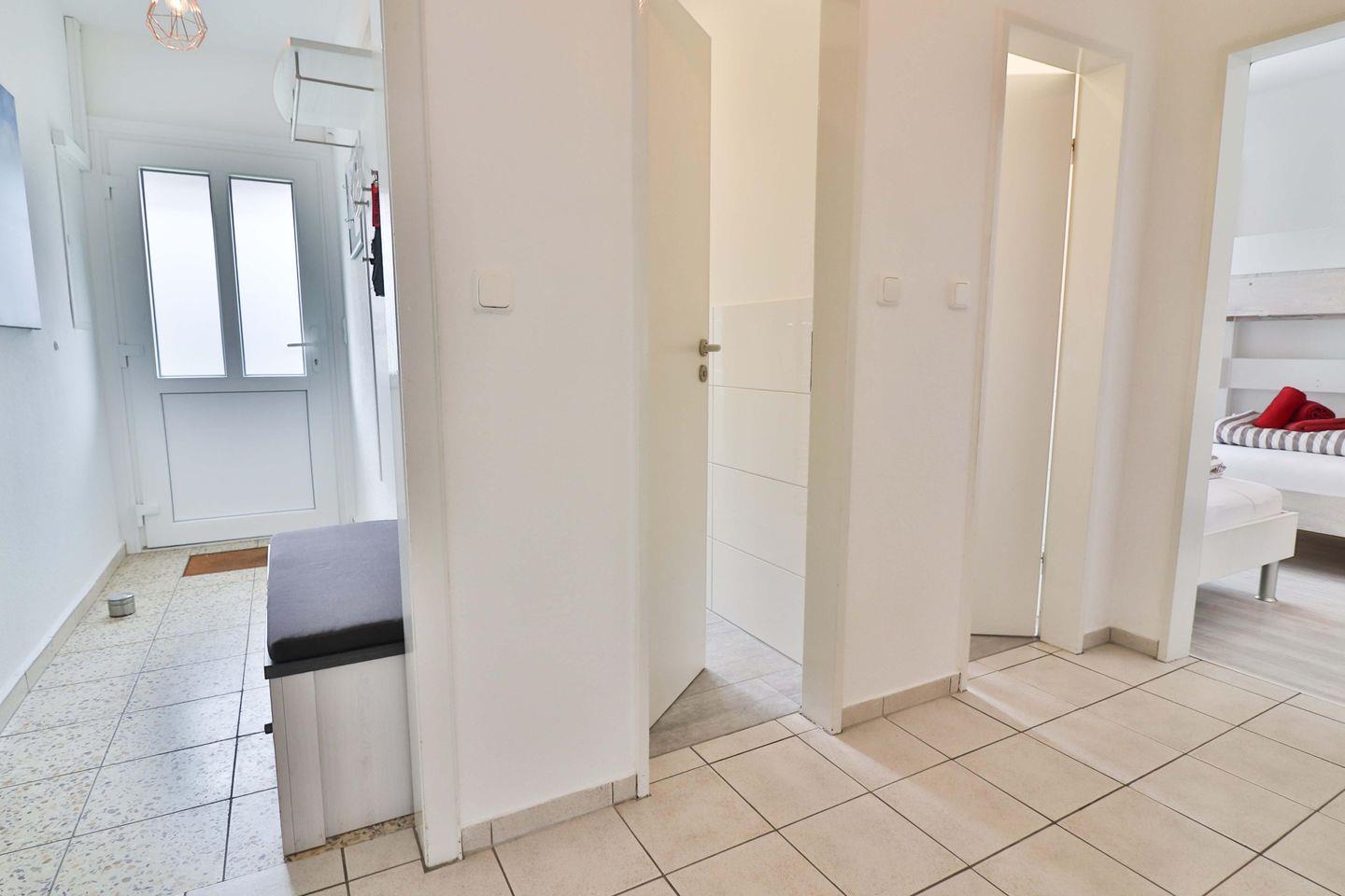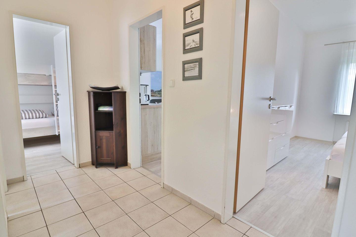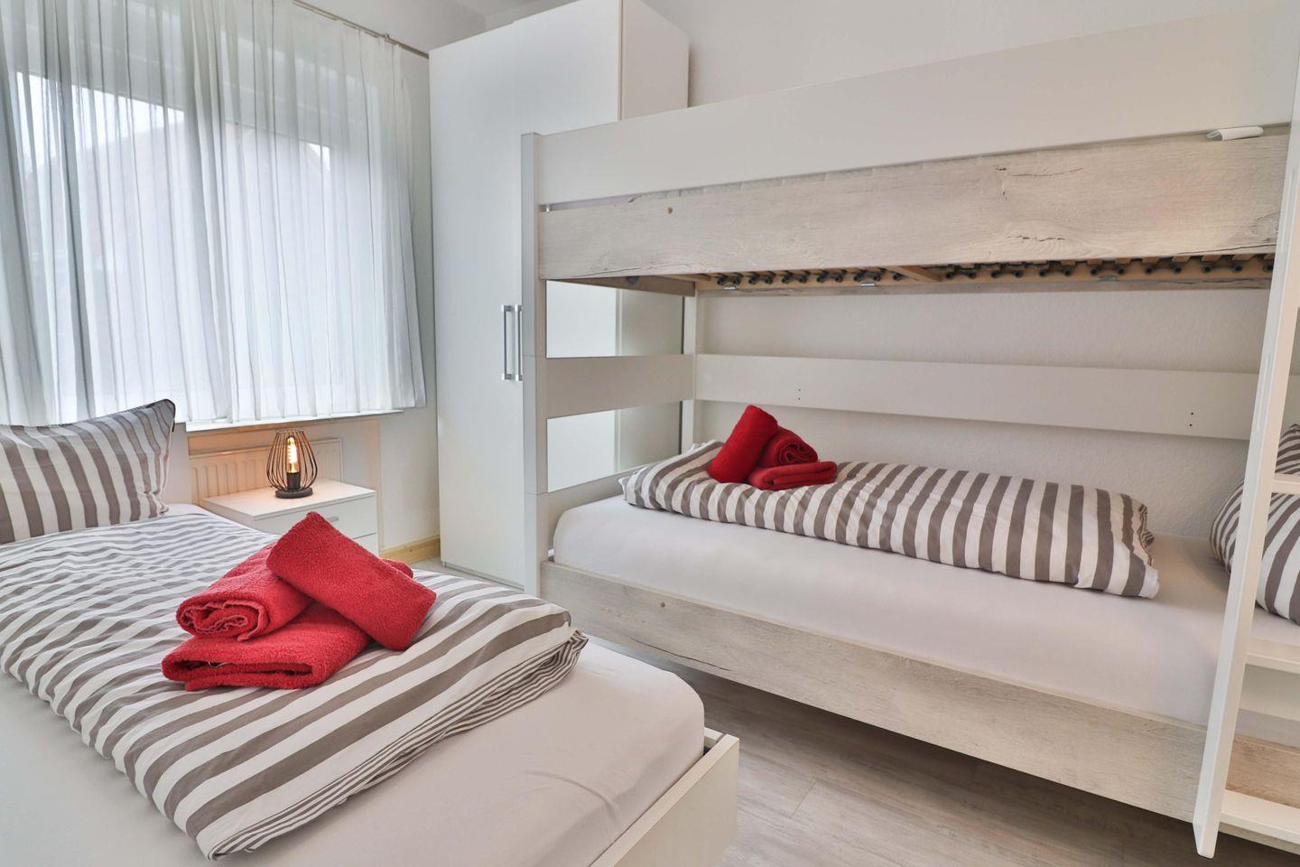 Die Wohnung verfügt über zwei Schlafzimmer. Im ersten Schlafzimmer erwartet Sie ein komfortables Doppelbett (180 x 200 cm), sowie ein geräumiger Kleiderschrank, eine Kommode und ein praktisches Waschbecken. Das zweite Schlafzimmer ist perfekt für Kinder oder weitere Gäste eingerichtet, mit einem Etagenbett, einem zusätzlichen Einzelbett (alle je 90 x 200 cm), ebenfalls einem Kleiderschrank und einem Waschbecken. Bitte beachten Sie, dass im oberen Hochbett im Verhältnis zur Matratze der Rausfallschutz (die Holzbegrenzung nach vorne) sehr niedrig ist.