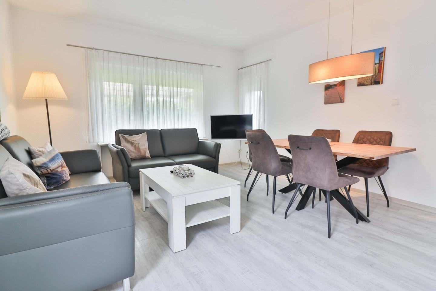 Das Herzstück der Ferienwohnung Robbe ist das großzügige Wohn- und Esszimmer mit integrierter Küchenzeile. Sie ist ausgestattet mit einem Ceranfeld, einer Mikrowelle, einem Kühlschrank, einer Spülmaschine, einer Kaffeemaschine, einem Wasserkocher, einem Toaster, einem Eierkocher und weiteren Küchenutensilien. Der Wohnbereich lädt mit zwei gemütlichen Sofas und einem Fernseher zum Entspannen ein, während der Essbereich genügend Platz für gemeinsame Mahlzeiten bietet.