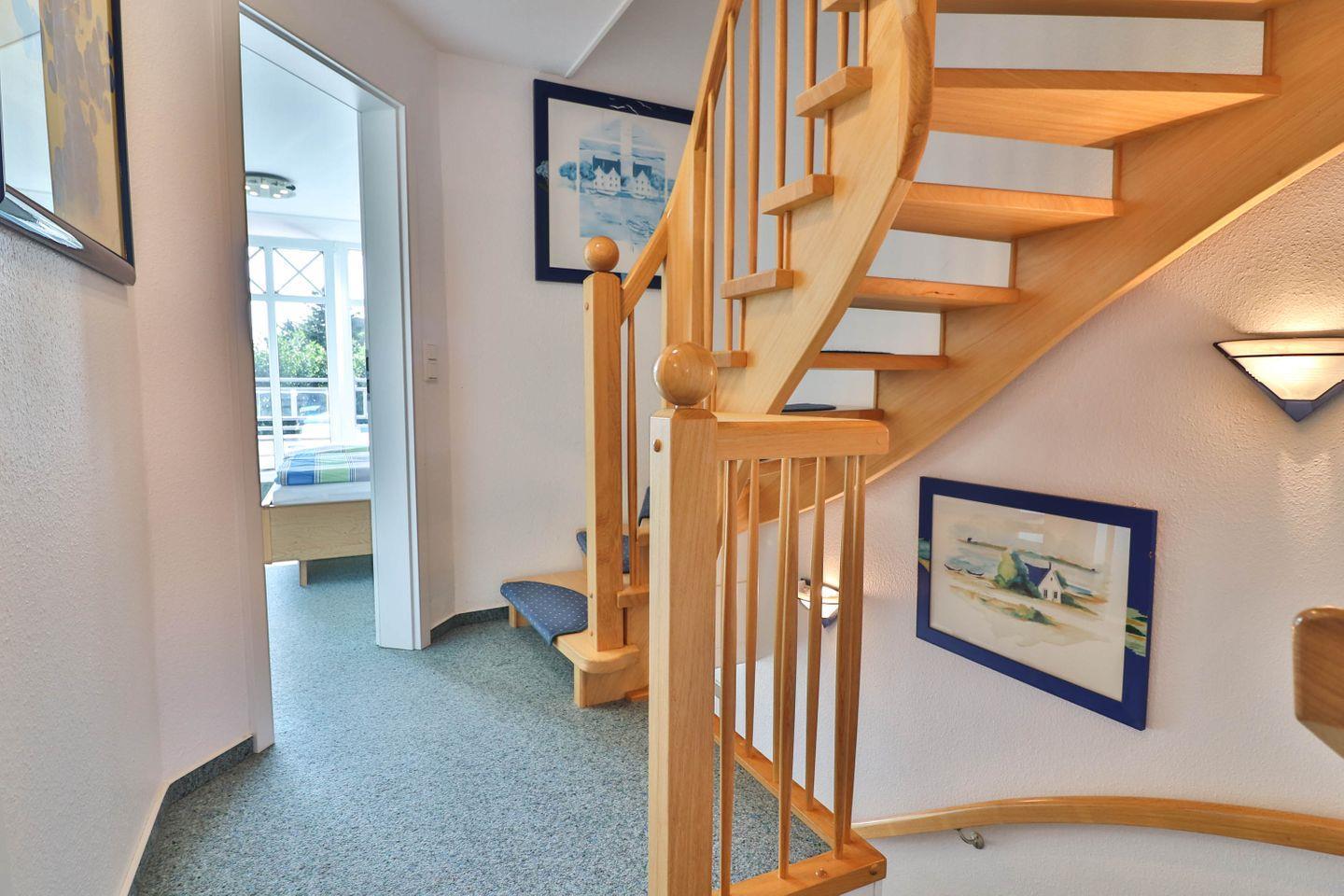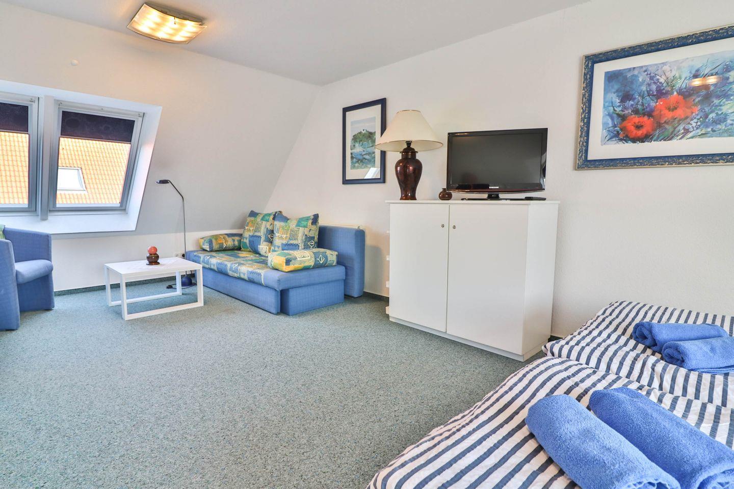 Im Dachgeschoss erwartet Sie ein behagliches Schlafzimmer mit Doppelbett (180 x 200 cm), einer komfortablen Sitzecke, Fernseher und Kleiderschrank. Das Schlafzimmer im Obergeschoss bietet ebenfalls ein großes Doppelbett (180 x 200 cm), eine eigene Sitzecke, einen großen Kleiderschrank und einen sonnigen Balkon zur Südseite. Ein weiteres Schlafzimmer, ebenfalls im Obergeschoss, ist mit zwei Einzelbetten (je 90 x 200 cm) und einem Kleiderschrank ausgestattet – ideal für Kinder oder Gäste.