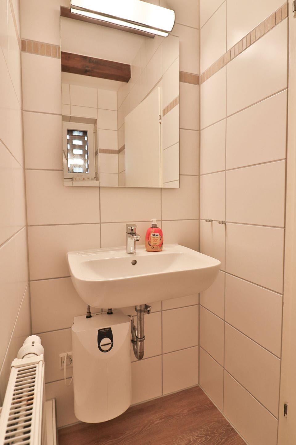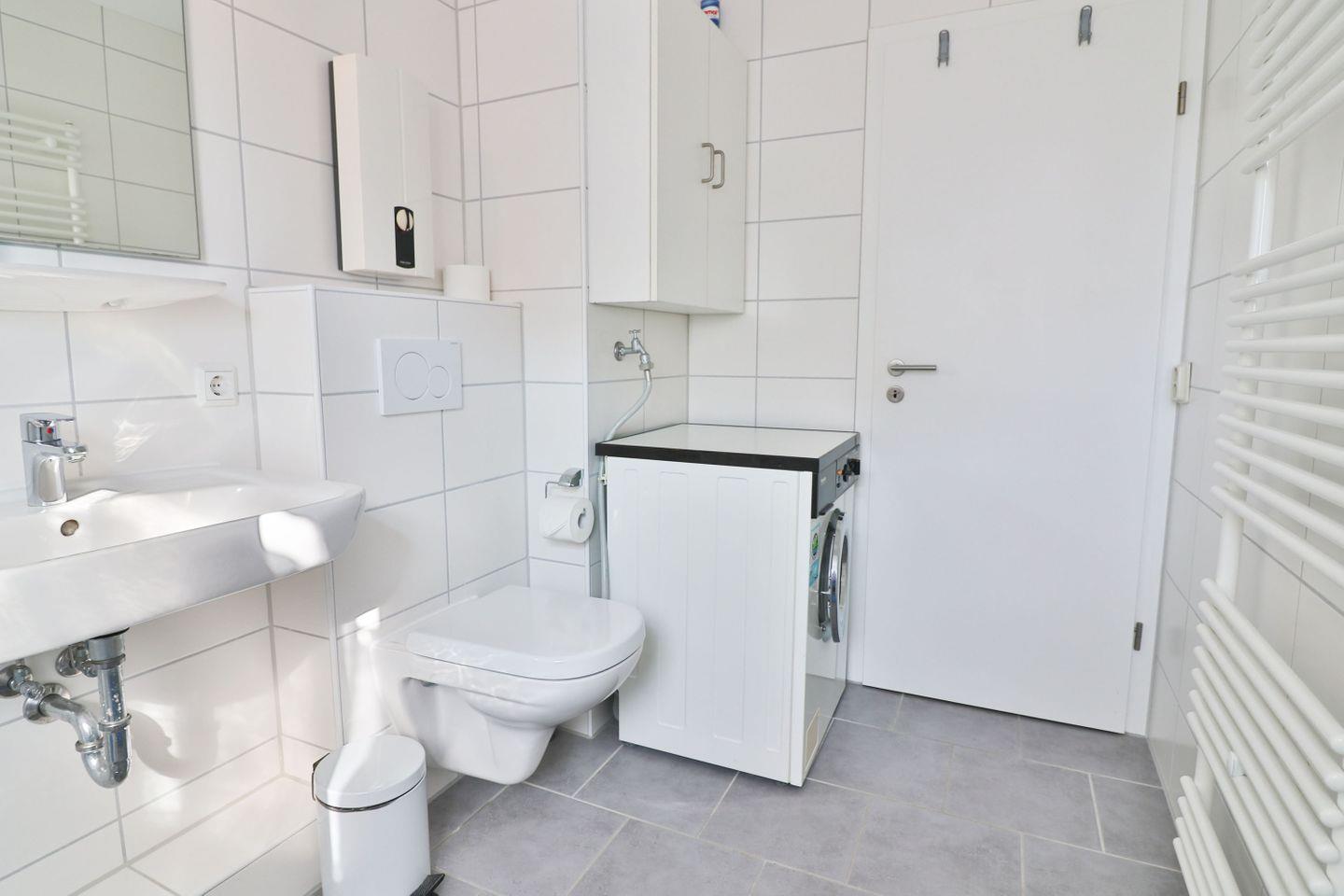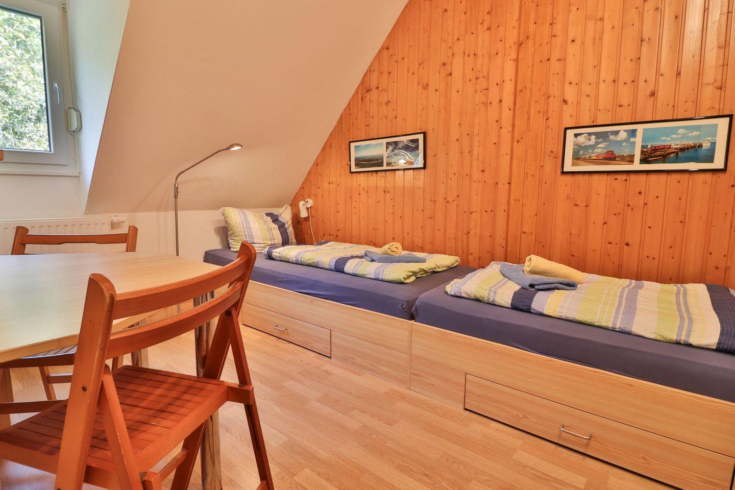 Das Obergeschoss beherbergt zwei Schlafzimmer und ein Badezimmer. Das erste Schlafzimmer ist mit einem Doppelbett (180 x 200 cm) und einem geräumigen Kleiderschrank ausgestattet, während das zweite Zimmer über zwei Einzelbetten (1x 90 x 190, 1x 90 x 200 cm), ebenfalls einen Kleiderschrank sowie einen Schreibtisch verfügt. Beide Schlafzimmer sind mit praktischen Außenrollos versehen, die für eine angenehme Verdunkelung sorgen. Das moderne Badezimmer bietet eine Dusche, ein Waschbecken, eine Toilette sowie eine Waschmaschine, die den Gästen kostenfrei zur Verfügung steht.