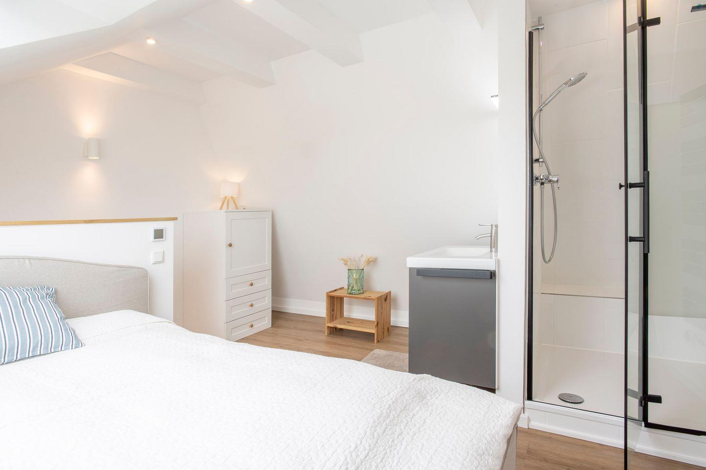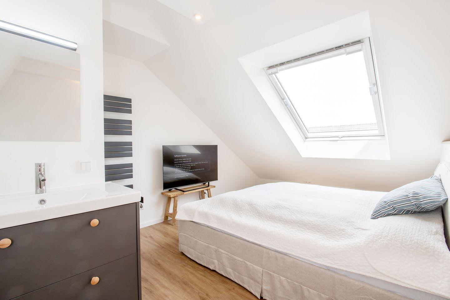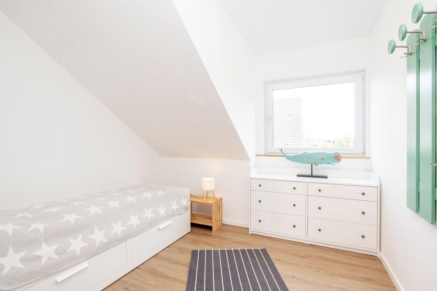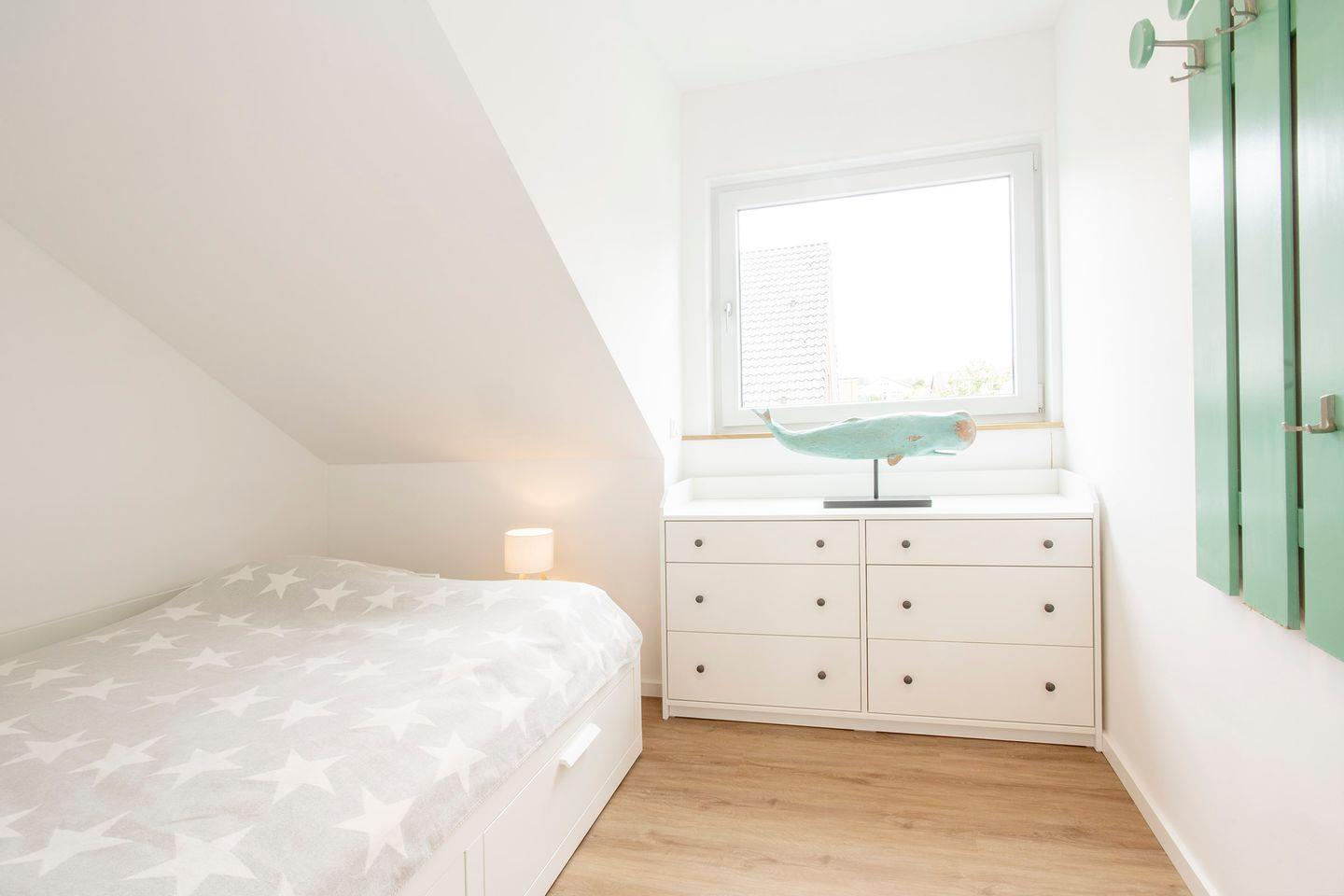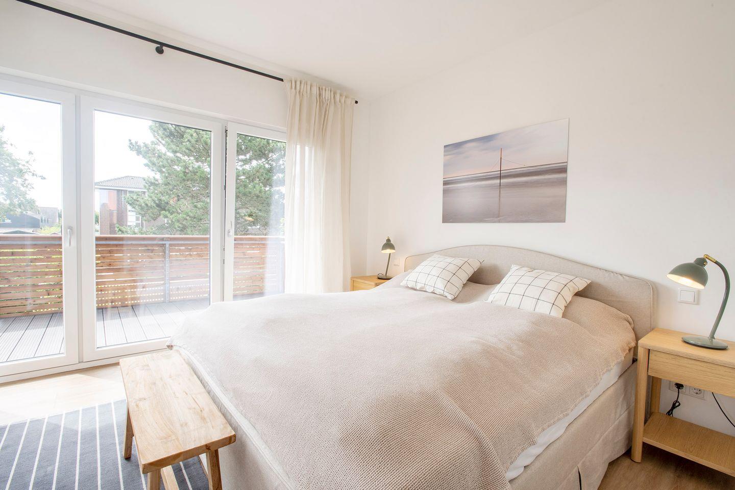 Die 3 Schlafzimmer haben Platz für 6 Personen. In der 1. Etage befindet sich 1 Elternschlafzimmer mit Doppelbett sowie Zugang zum Balkon und das Kinderzimmer mit Einzelbett, welches ausziehbar zum Doppelbett werden kann.