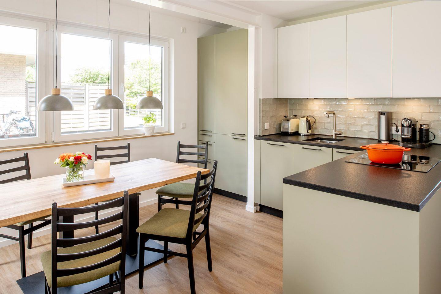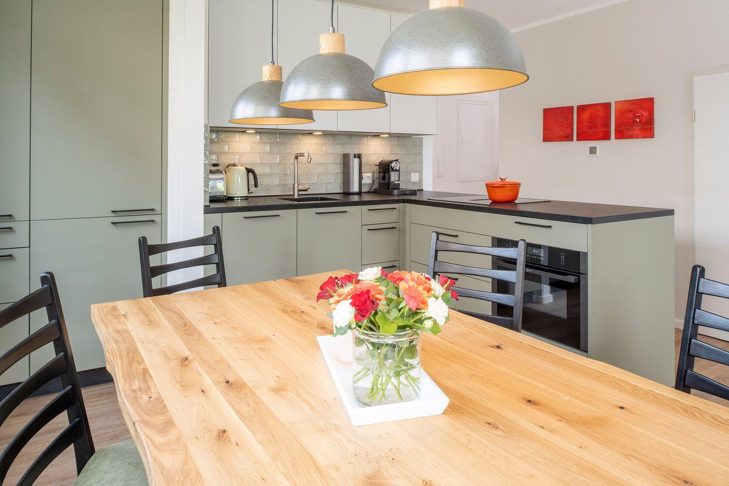Diese empfängt Sie im Erdgeschoß, durch den geräumigen Flur, mit einer voll ausgestatteten stylischen Küche und dem angrenzendem Essbereich im Erker - hier können Sie schon beim Frühstück den Blick in den Garten genießen.