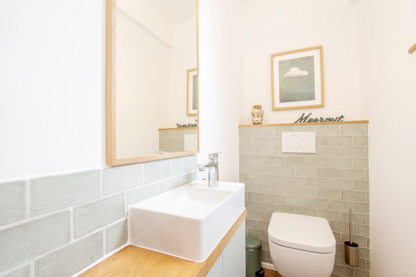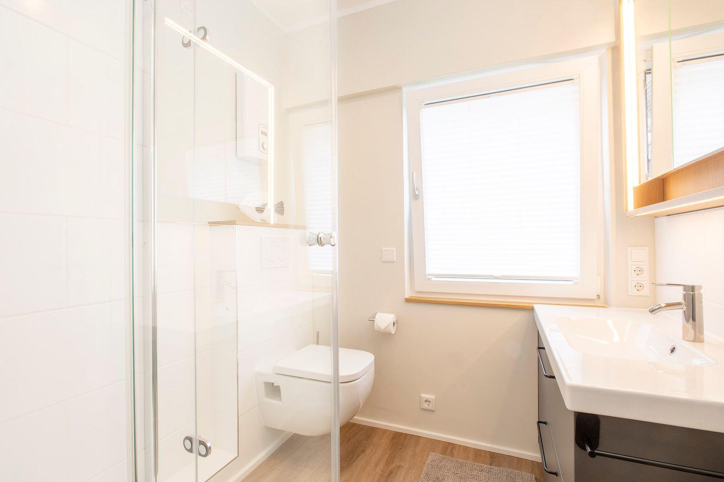 Die Etage bietet weiterhin das Hauptbad mit bodengleicher Dusche, Waschtisch und WC.