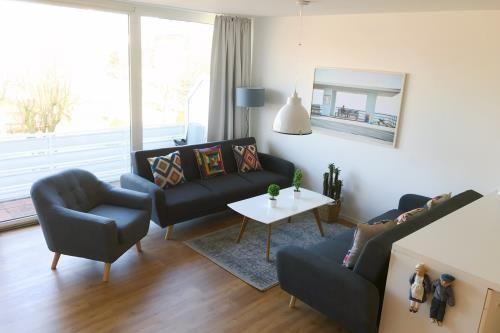 Modernes Strandquartier auf Langeoog mit Balkon und Blick auf den Kurpark, ideal für erholsame Tage zu zweit.