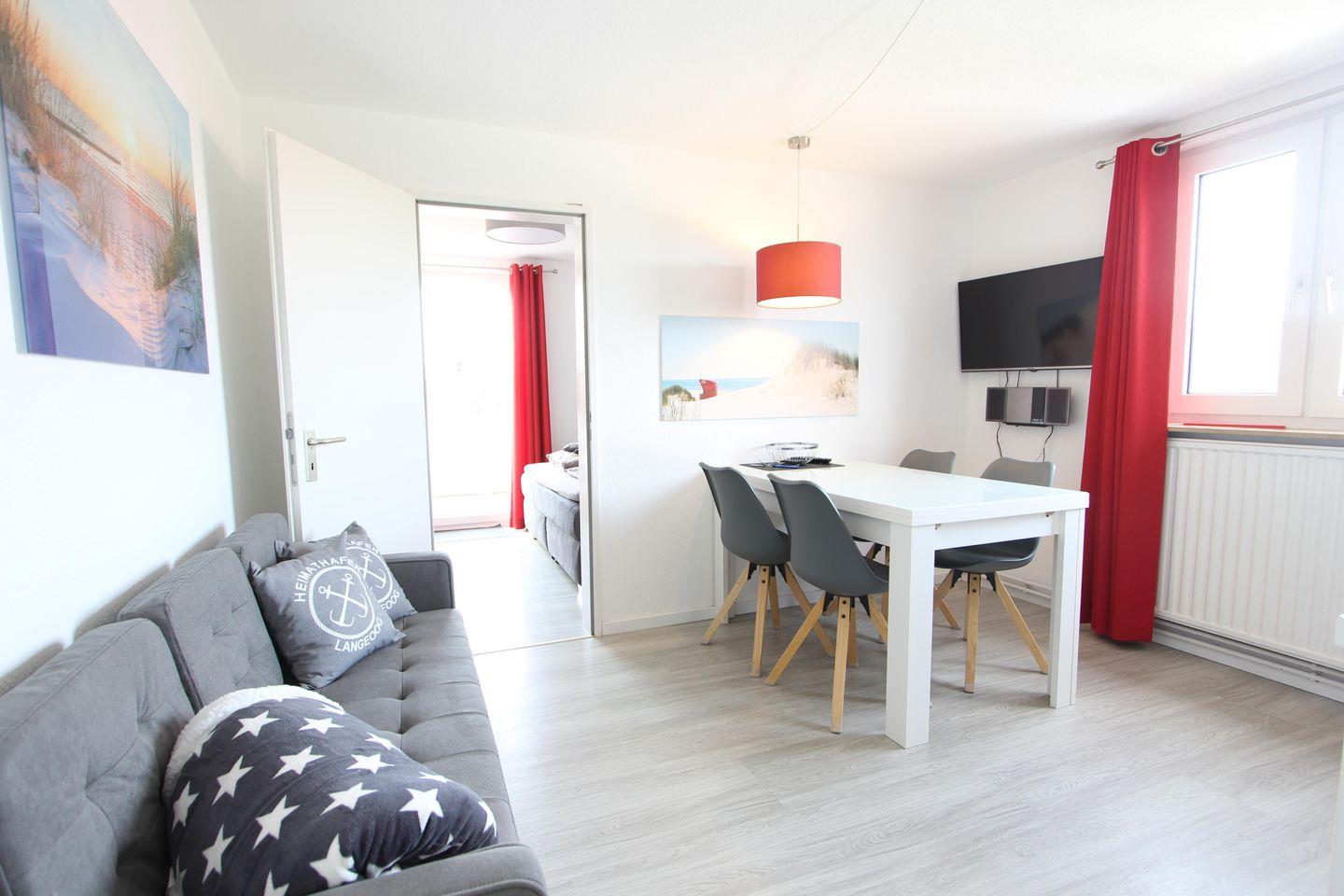 Charmante Obergeschosswohnung Mantelmöwe auf Langeoog mit Balkon, moderner Ausstattung und Nähe zu Einkauf und Restaurant.