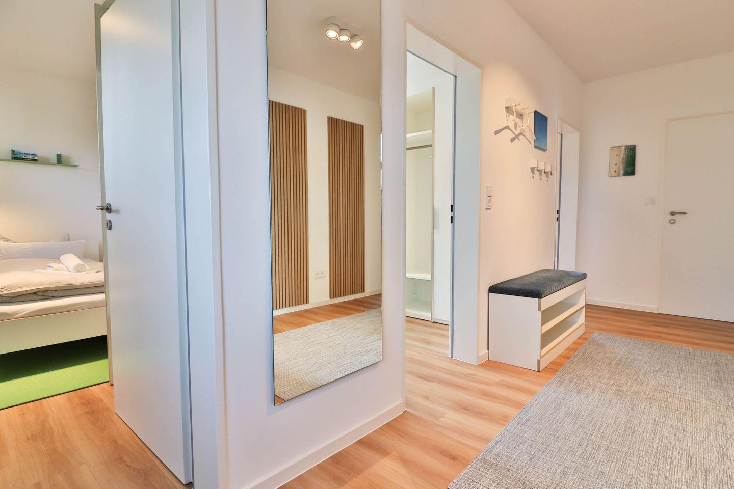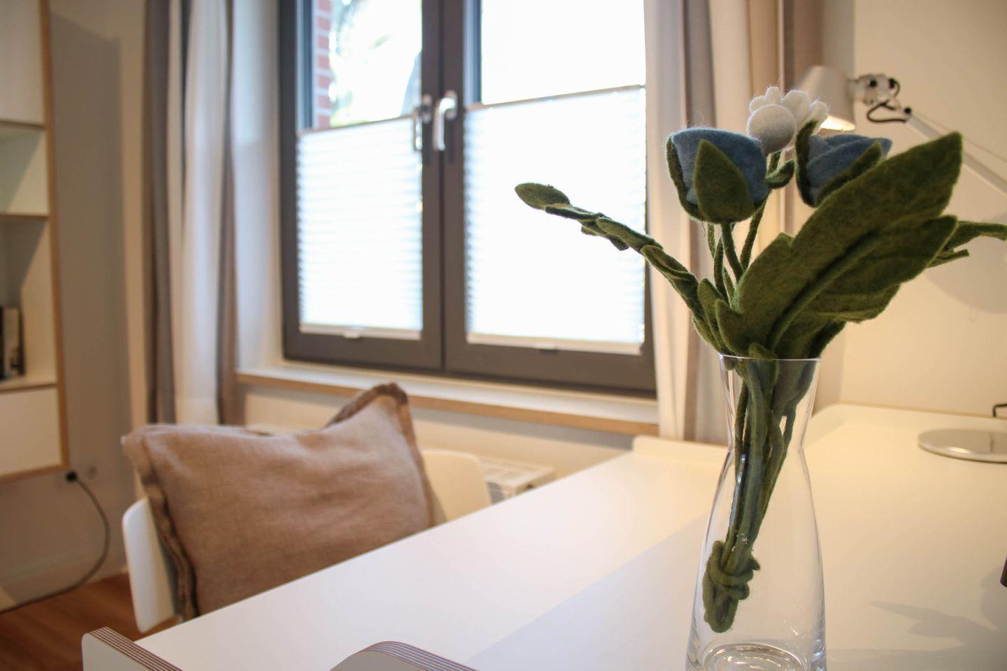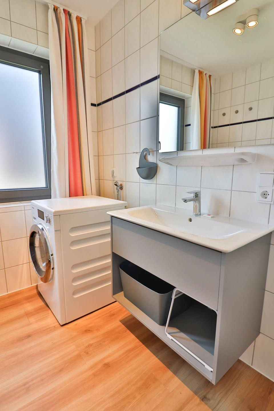 Das moderne Badezimmer verfügt über eine Dusche, ein Waschbecken, eine Toilette und einen eigenen Waschtrockner für maximale Unabhängigkeit. Zudem sorgen Plissees an allen Fenstern für angenehmen Sichtschutz und Privatsphäre. Check-In und Check-Out erfolgen kontaktlos über Schlüsseltresore.