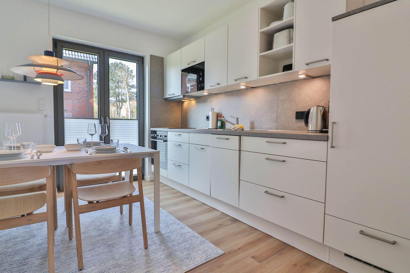 Der lichtdurchflutete Wohn- und Essbereich bildet das Herzstück der Wohnung. Hier können Sie entspannen, gemeinsam essen und die Zeit genießen. Die offene Küchenzeile ist mit allem ausgestattet, was Sie für einen komfortablen Aufenthalt benötigen: Herd, Backofen, Kühlschrank mit Gefrierfach, Mikrowelle, Spülmaschine, Kaffeemaschine, Wasserkocher, Toaster und Mixer. Hier können Sie Ihre Lieblingsgerichte auch im Urlaub problemlos zubereiten.