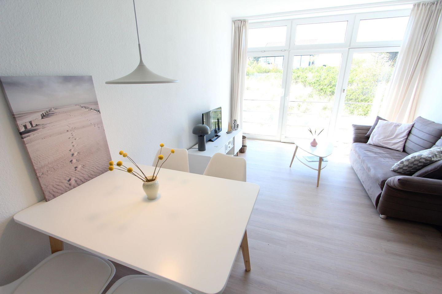 Dieses Schmuckstück befindet sich in einem inseltypischen Klinkerbau in strandnaher, ruhiger, zentraler Lage. Die Wohnung mit optimalem Grundriss verfügt über ein Schlafzimmer mit Doppelbett (Maße 160x200 cm) und ein Schlafsofa, ein geräumiges Badezimmer sowie ein helles, großes Wohnzimmer mit integrierter Einbauküche; Geschirrspüler; Kochfeld; Backofen und Essplatz. Das Highlight sind die bodentiefen Fenster, die sich komplett öffnen lassen und Ihnen einen herrlichen Blick direkt in die wunderbare Dünenlandschaft bescheren - Meeresrauschen inklusive - garantiert!