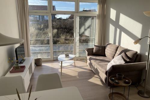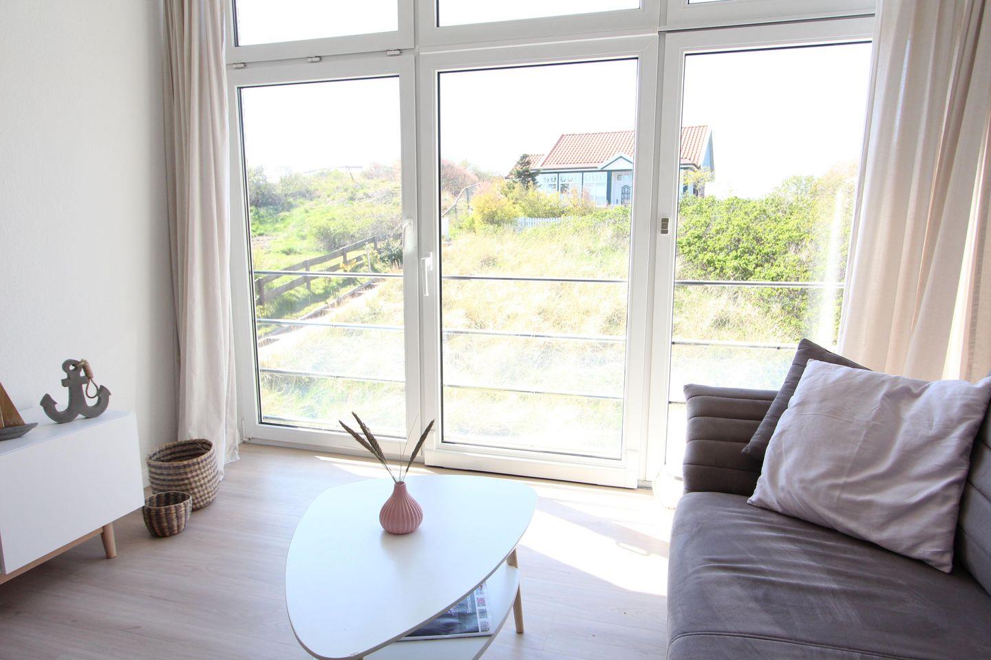 Das Highlight sind die bodentiefen Fenster, die sich komplett öffnen lassen und Ihnen einen herrlichen Blick direkt in die wunderbare Dünenlandschaft bescheren - Meeresrauschen inklusive - garantiert!