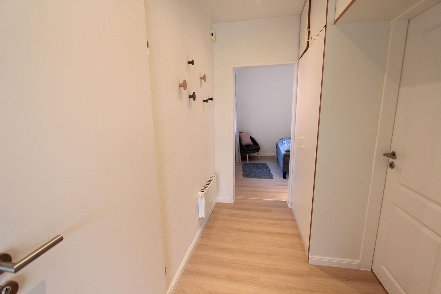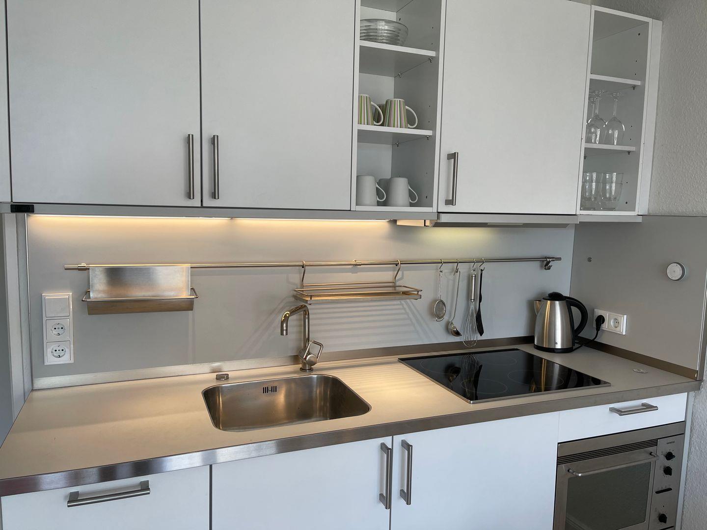 Wohnung mit einem Schlafzimmer mit Doppelbett (Maße 160x200 cm), ein geräumiges Badezimmer, ein helles, großes Wohnzimmer mit Schlafcouch, mit integrierter Einbauküche mit Geschirrspüler; Kochfeld; Backofen und Essplatz.