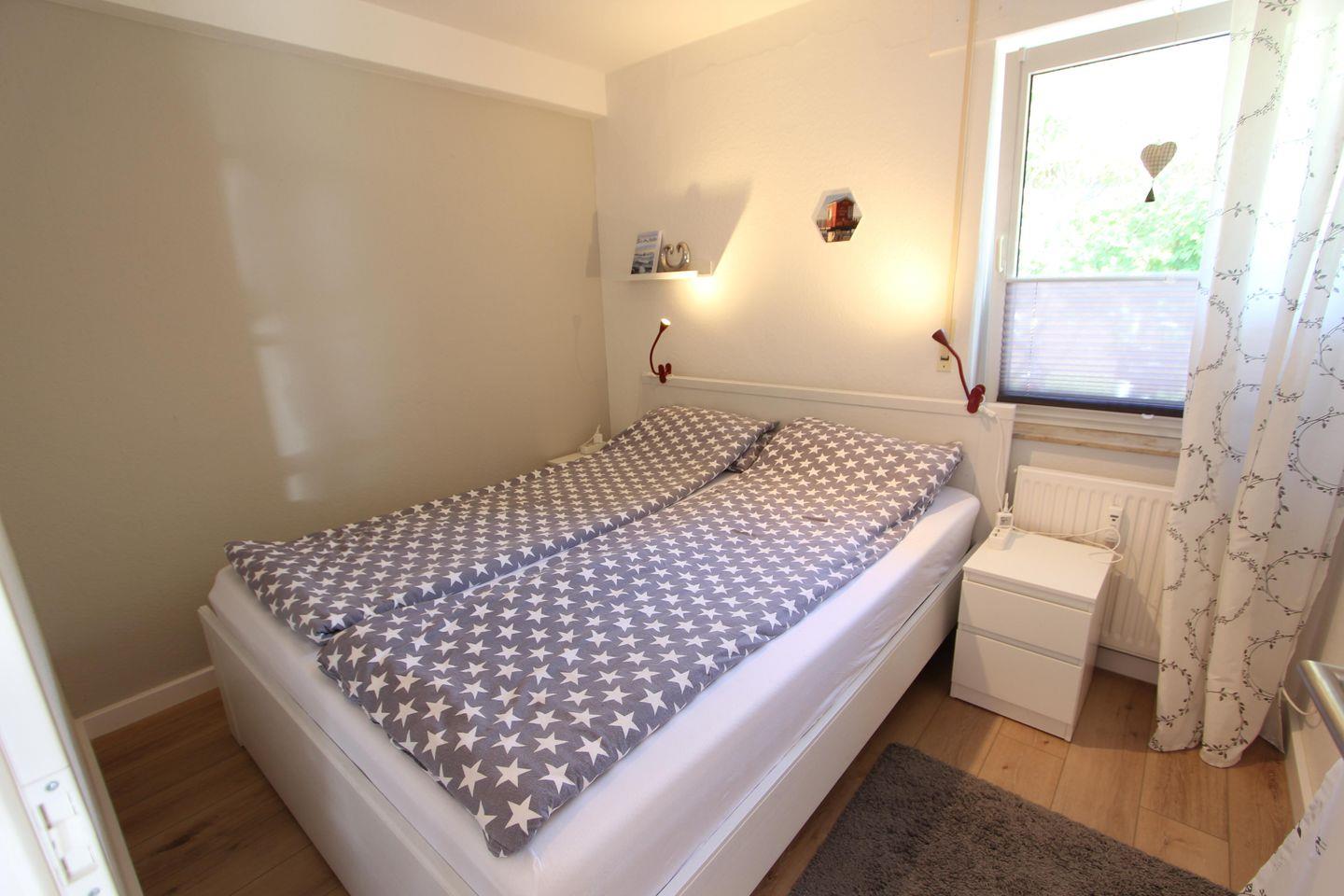 Es gibt zwei getrennte Schlafzimmer mit den Bettmaßen 160 cm x 200 cm und 120 x 200 cm.