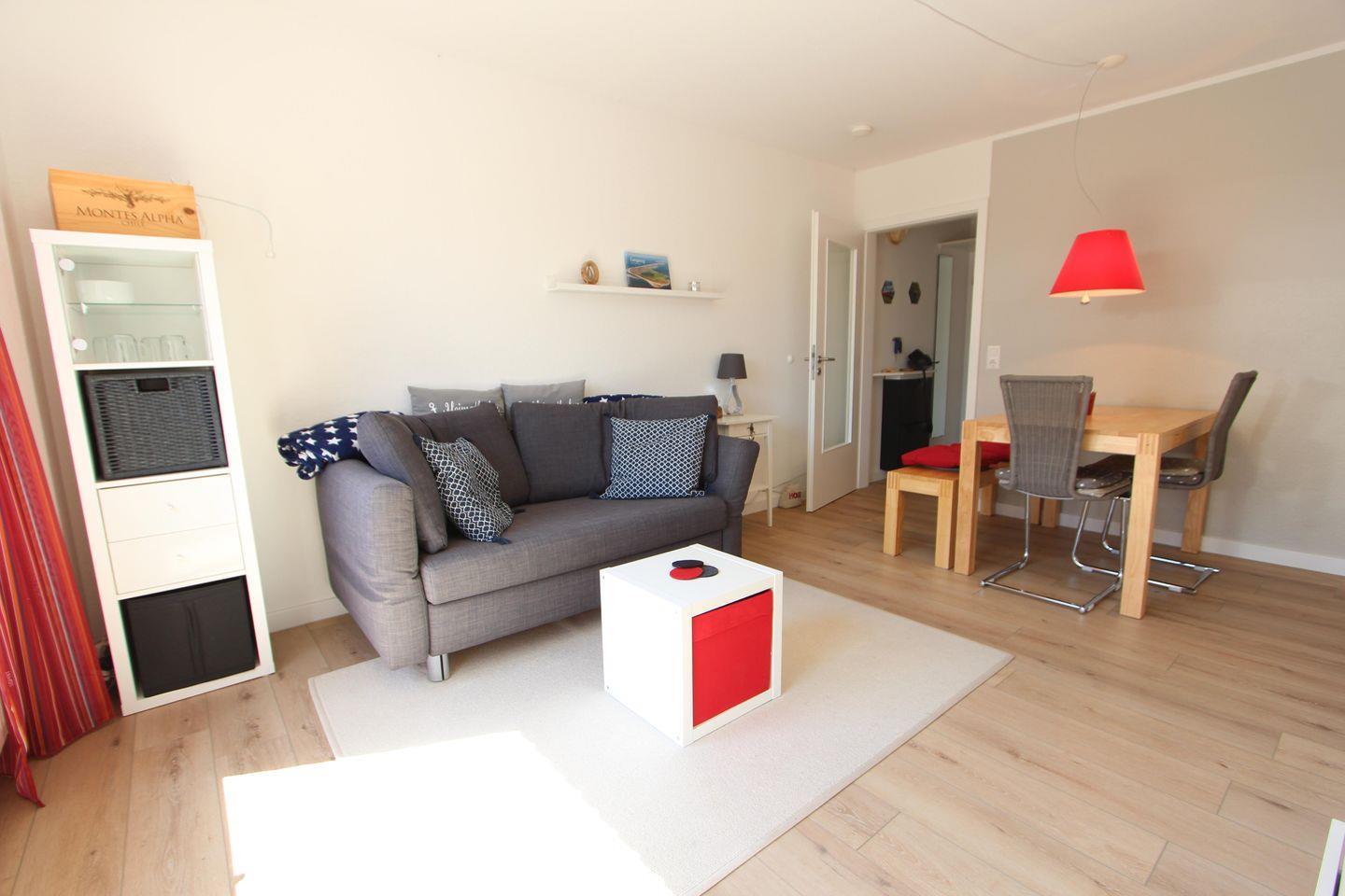 Sie bietet Euch auf ca. 40 m² ausreichend Platz für bis zu 3 Personen. Im hellen Wohnzimmer befindet sich eine Essecke und eine gemütliche Couch.