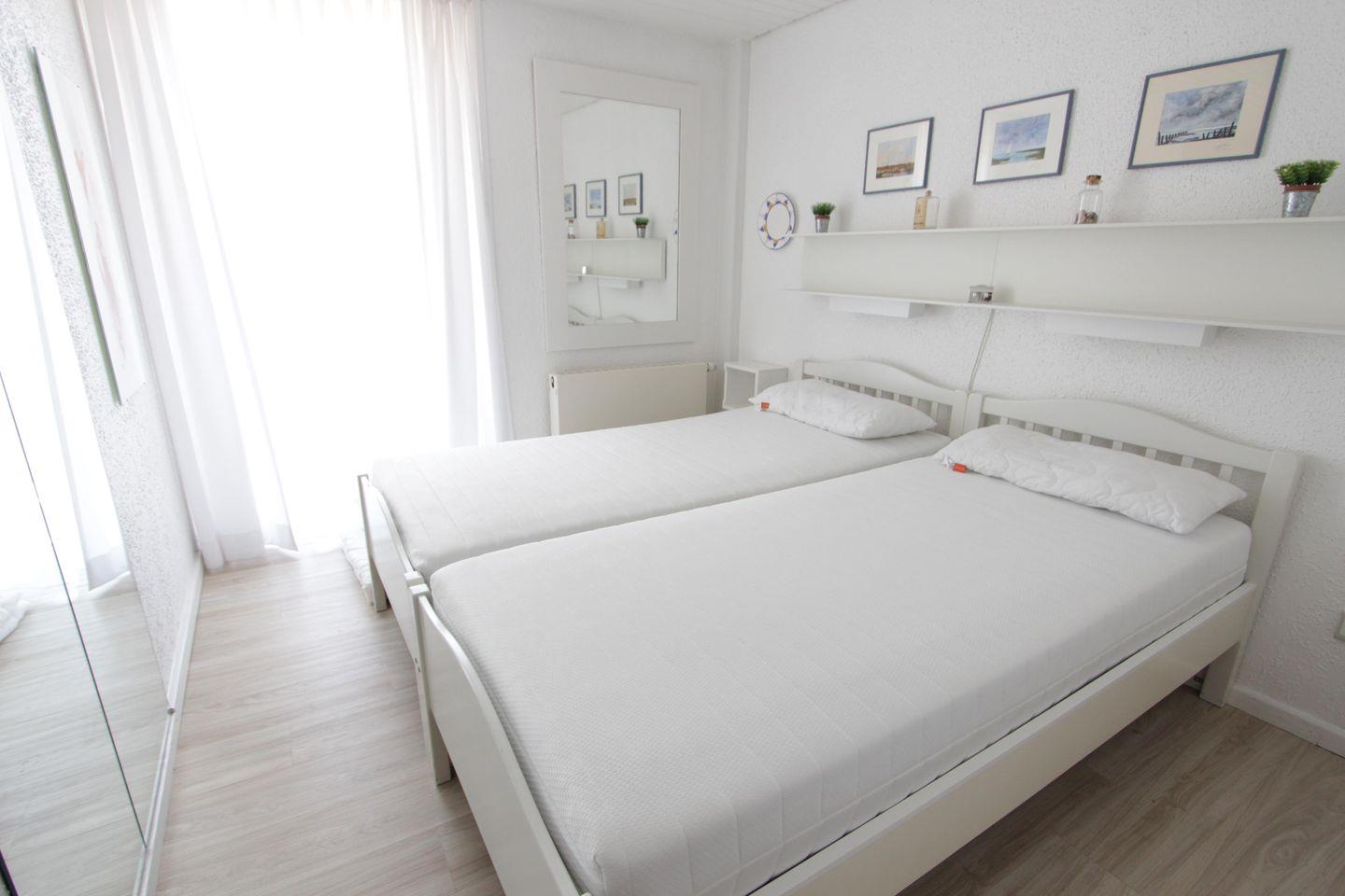 OG: 2 Schlafzimmer und das Tageslichtbadezimmer. 1 Schlafzimmer mit Doppelbett 180 cm x 200 cm Liegefläche und großen Einbauschränken. 1 Schlafzimmer mit Etagenbett 90 cm x 200 cm Liegefläche mit Übergang zum Balkon. Badezimmer mit Dusche und WC.