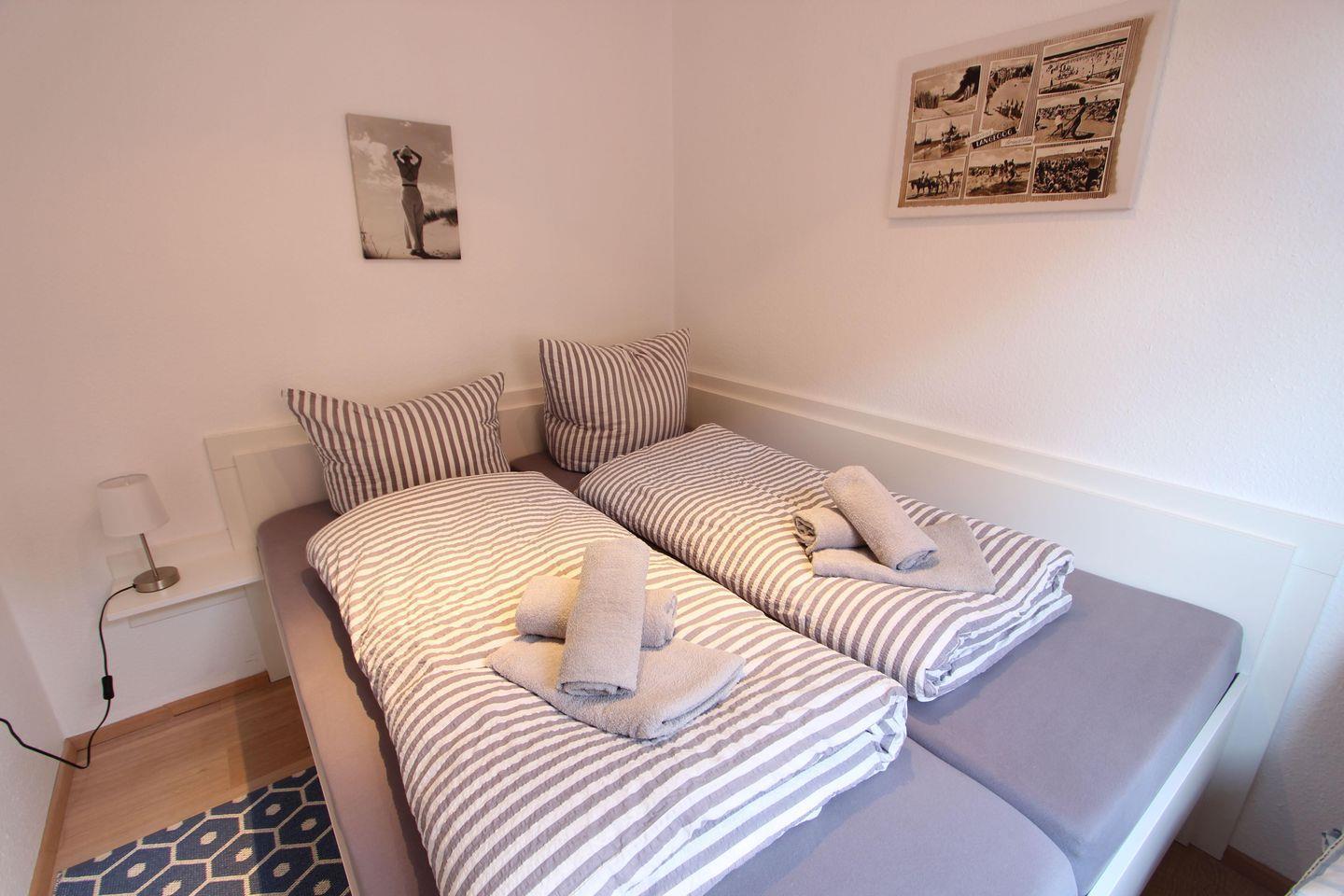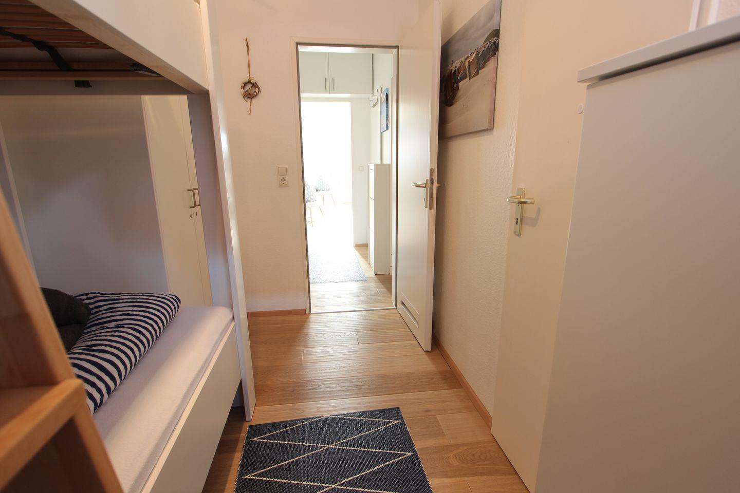 Durchgangsschlafzimmer mit Etagenbett und je einer Liegefläche von 90 cm x 200 cm, zweites Schlafzimmer mit Doppelbett und einer Liegefläche von 160 cm x 200 cm.
