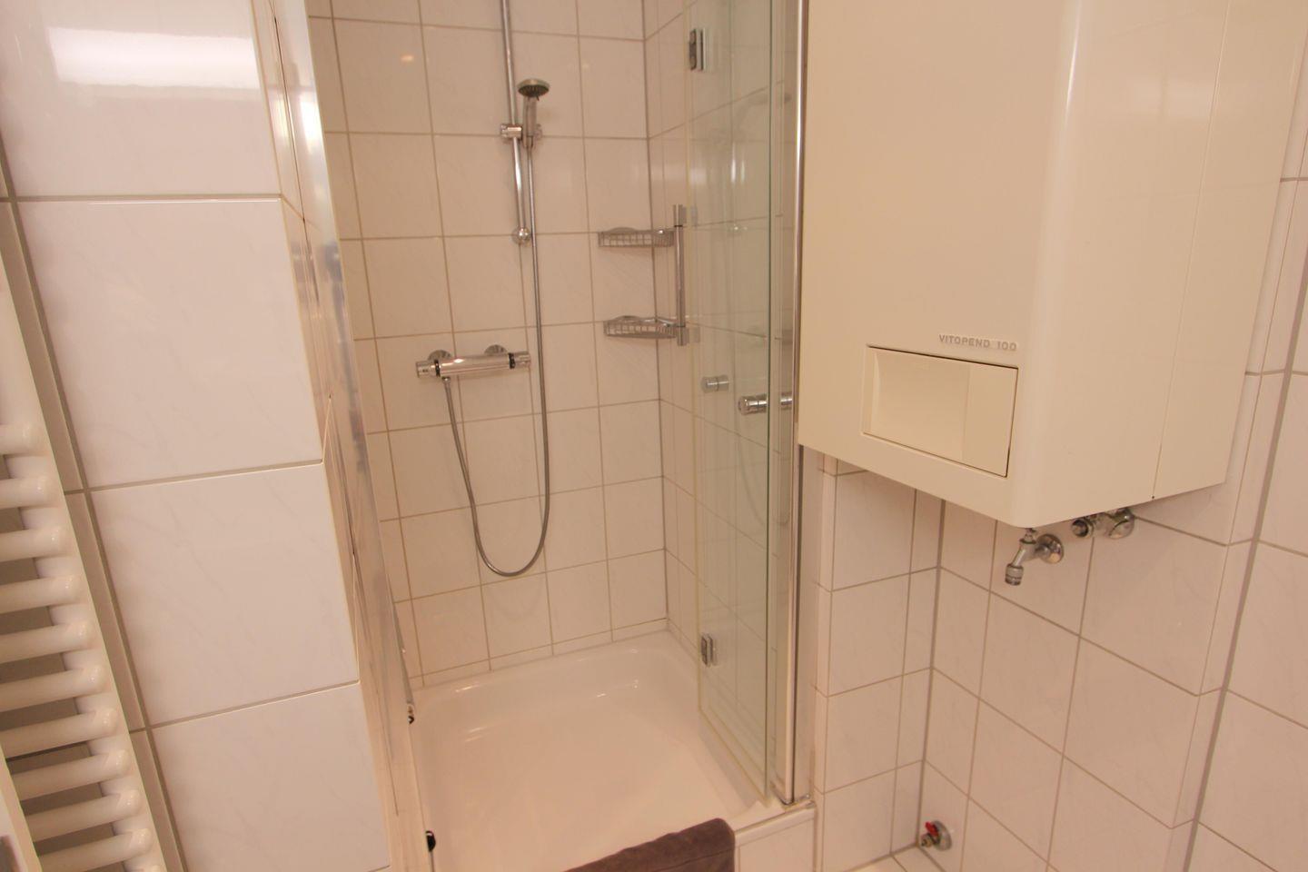 Das Badezimmer ist mit Dusche und WC ausgestattet.