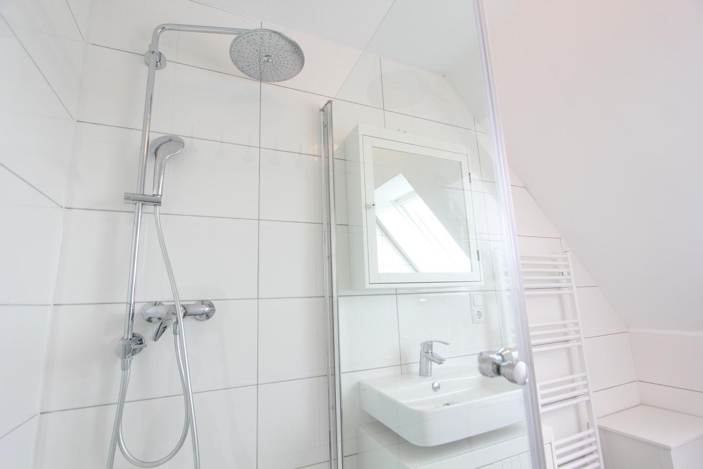 Das Badezimmer ist mit Dusche und WC ausgestattet.