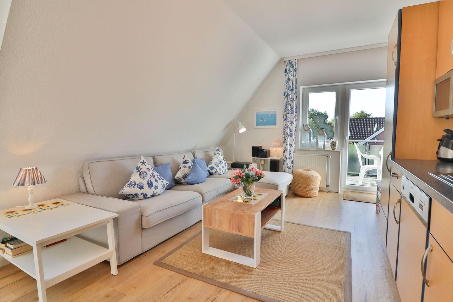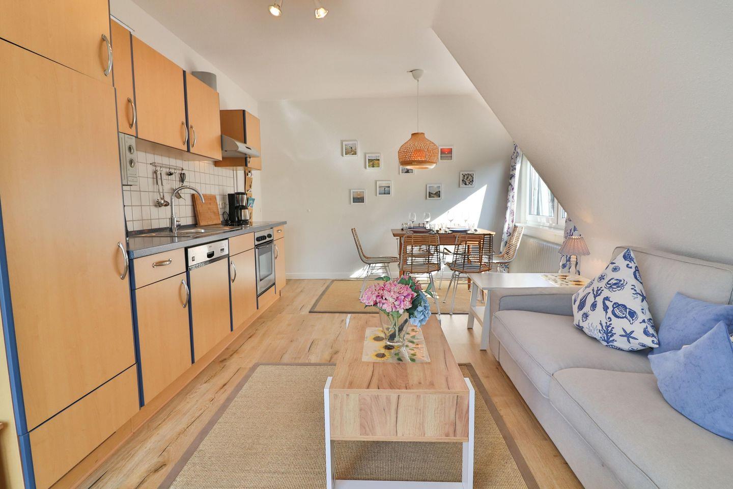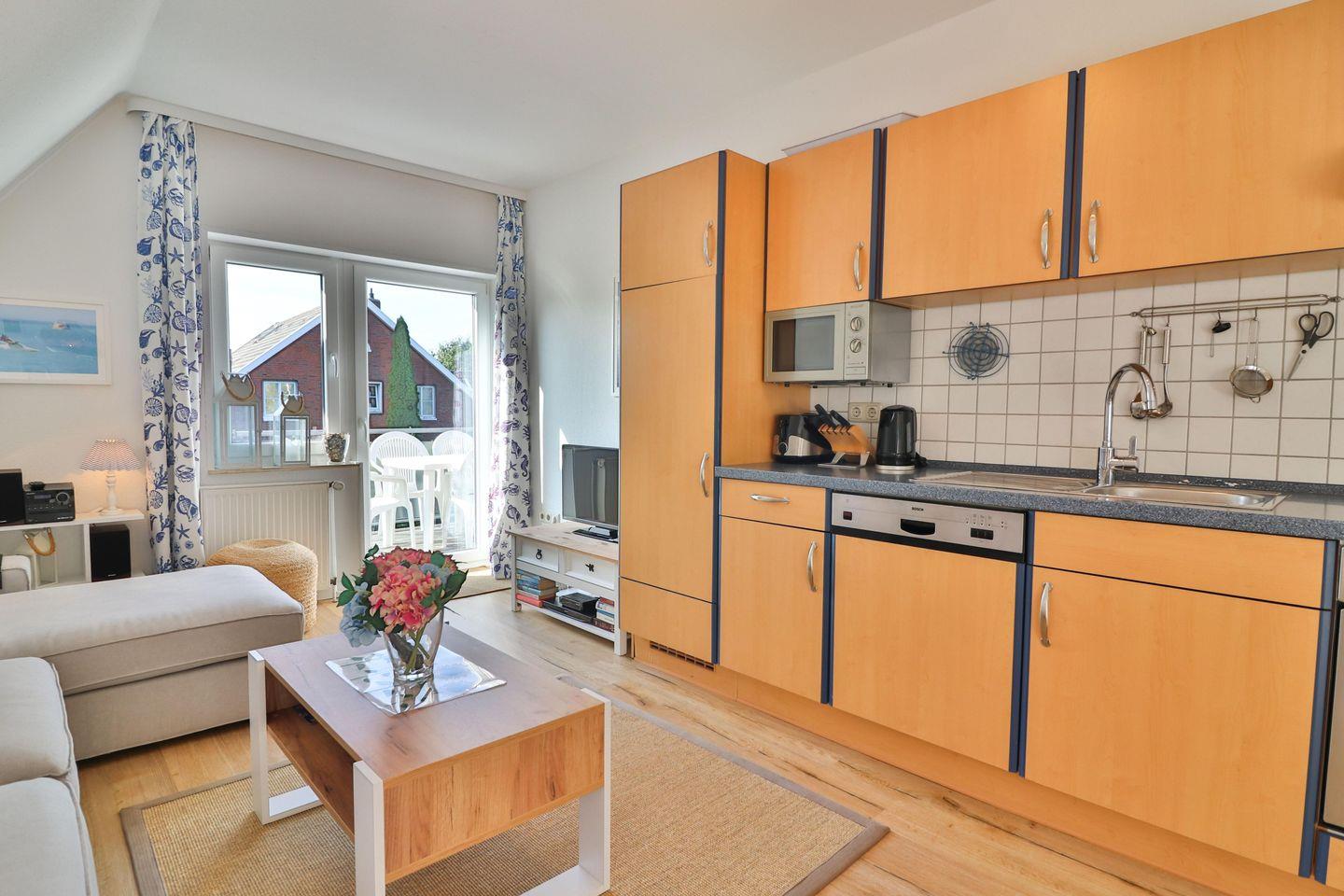 Wohnzimmer mit voll ausgestattete Wohnküche u.a. mit Geschirrspüler, Backofen und vielen weiteren Küchenhelfern