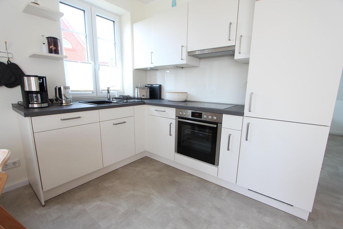 Die Küchenzeile verfügt u. a. über ein Kochfeld, Backofen, Geschirrspüler und vielen weiteren Küchenhelfern.
