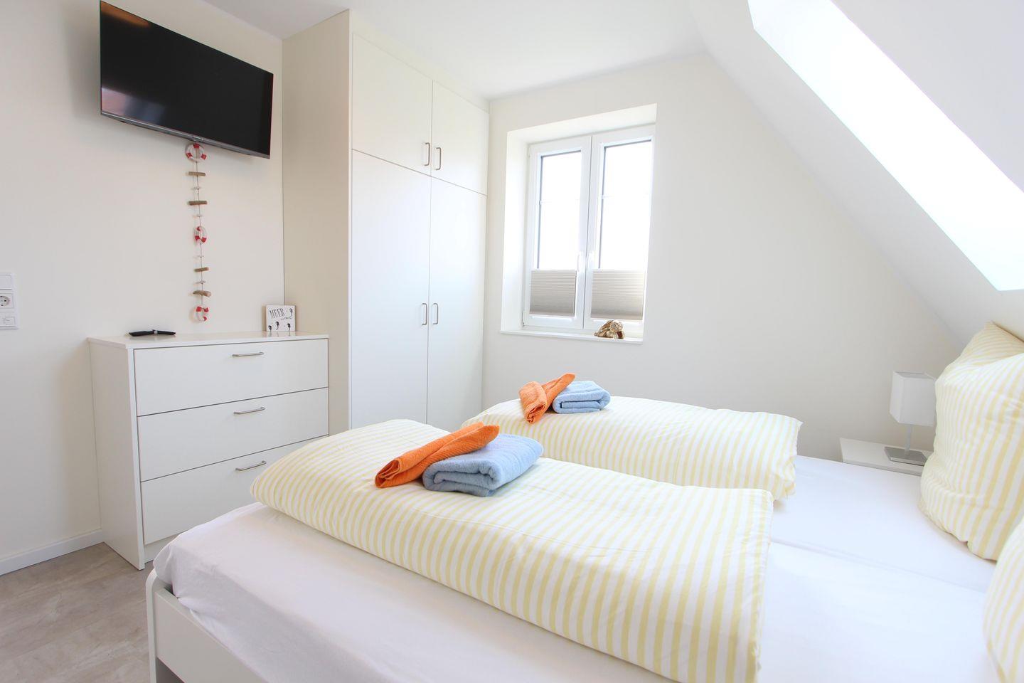 Beide Schlafzimmer verfügen über Doppelbetten mit den Maßen 180 cm x 200 cm, eines mit TV und eines mit Schreibtisch.