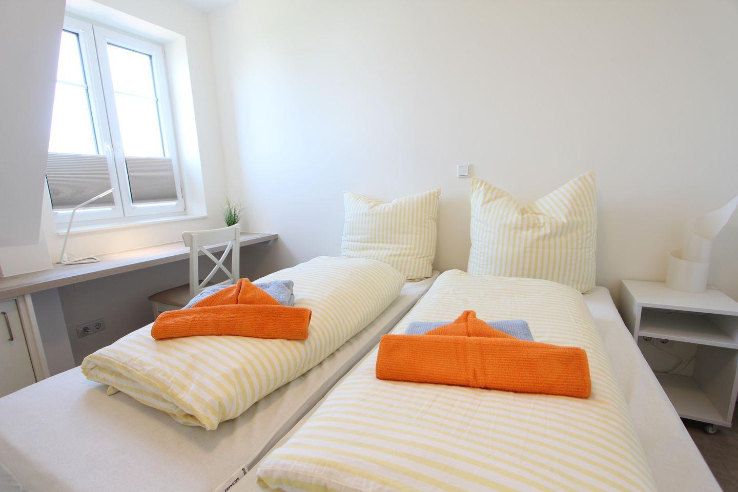Schlafzimmer mit Doppelbetten (180 cm x 200 cm), eines mit TV und eines mit Schreibtisch.