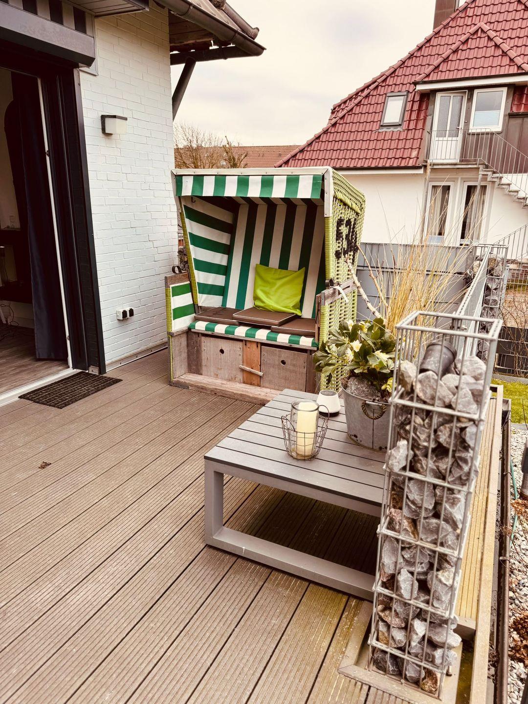 Moderne Ferienwohnung Düne 11 auf Langeoog mit Sauna, Balkon und eingezäuntem Garten für entspannte Urlaubstage.