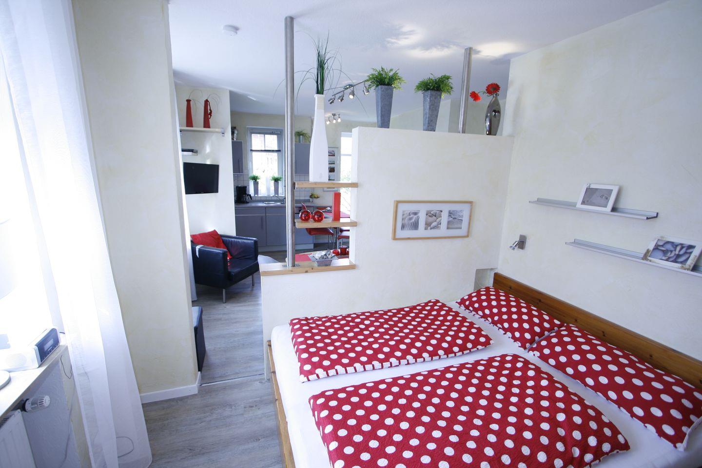 Freundliche, helle Ferienwohnung im Erdgeschoss, ca. 40 m², 1 Schlafzimmer mit Etagenbett, 1 Wohn-/Schlafraum mit Doppelbett, welcher durch eine halbhohe Trennmauer vom Wohn-/Essbereich abgetrennt ist.