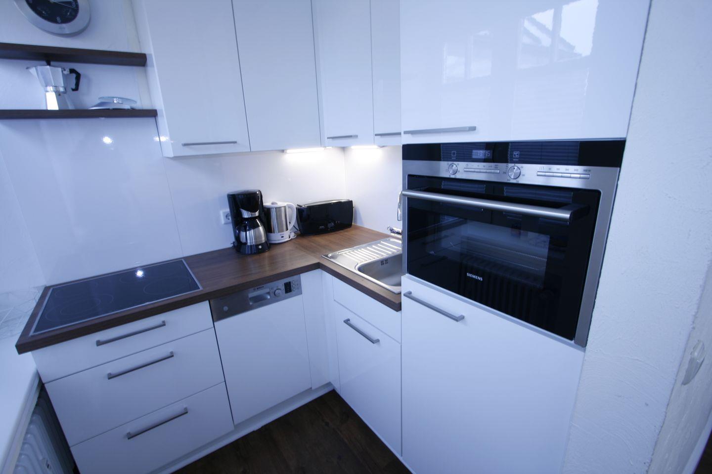Wunderschöne, helle Ferienwohnung im EG, ca. 40 m², 1 Schlafzimmer mit Doppelbett, 1 Schlafzimmer mit Etagenbett, neu komplett ausgestattete Einbauküche im Wohnraum mit Geschirrspüler und kleinem Backofen, Bad mit Dusche und WC, Kabel-TV Flachbildschirm, HiFi-Anlage und CD-Player im Wohnraum.