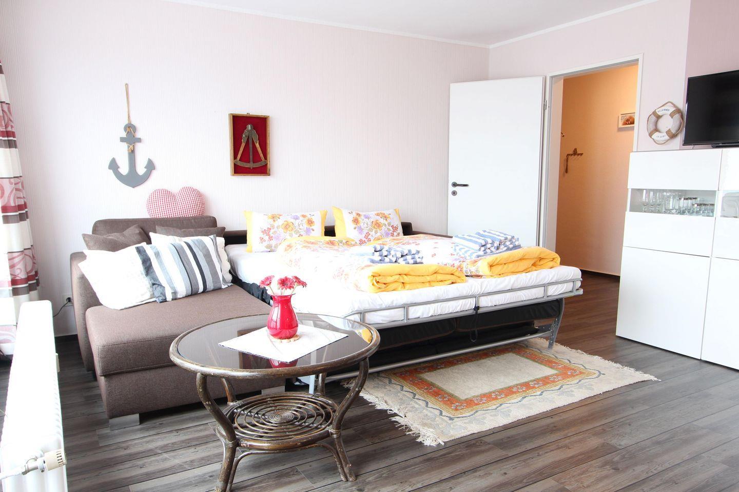 Ein-Raum-Appartement, ca. 36 m², Wohn-/Schlafbereich ist ausgestattet mit einem modernen Schlafsofa (165 cm x 200 cm Liegefläche), Flachbild-TV, vollwertig eingerichtete Küchenzeile (Kühlschrank, Backofen, Cerankochfeld, Wasserkocher und Kaffeemaschine), Esstisch mit 4 Personen