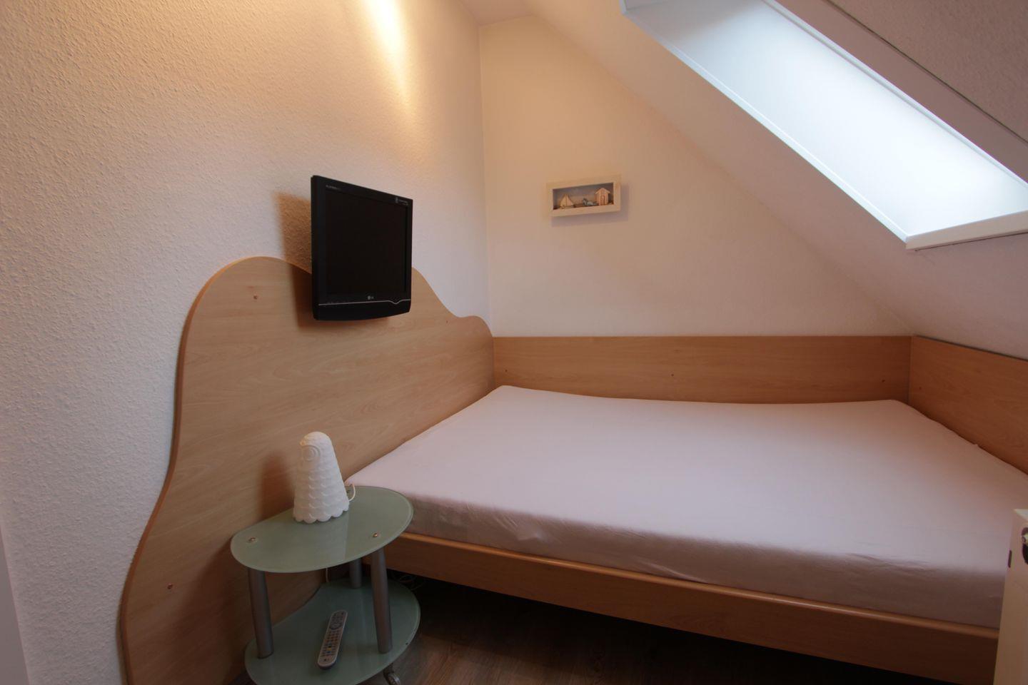 Zwei getrennte Schlafzimmer mit den Bettmaßen 140 cm x 200 cm und 180 cm x 200 cm.