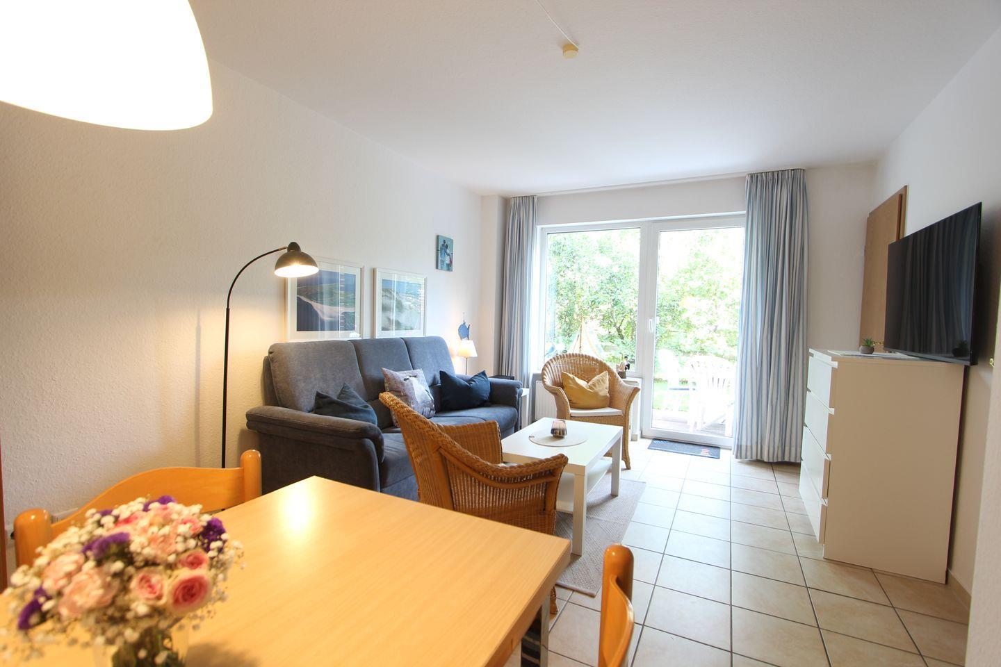 Eine liebevoll und modern eingerichtete Ferienwohnung (ca.45 qm): vom Wohnzimmer Zugang zur Terrasse mit Strandkorb und Garten.