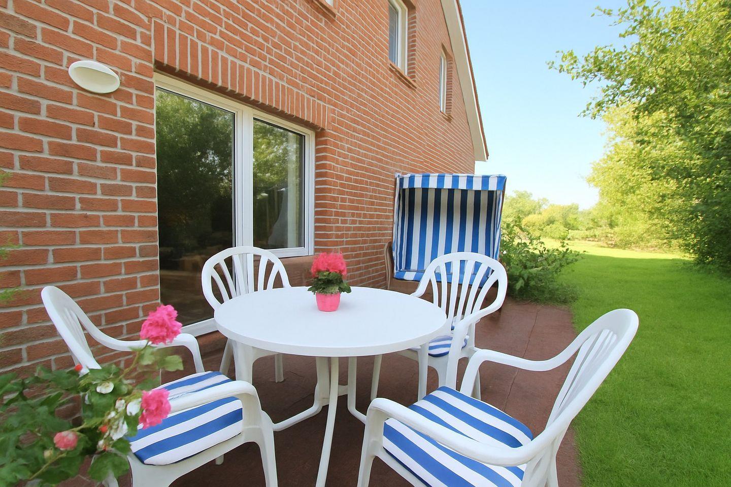 Moderne Ferienwohnung Steuerbord auf Langeoog mit Terrasse, Garten und Strandkorb – ideal für erholsame Tage am Meer.