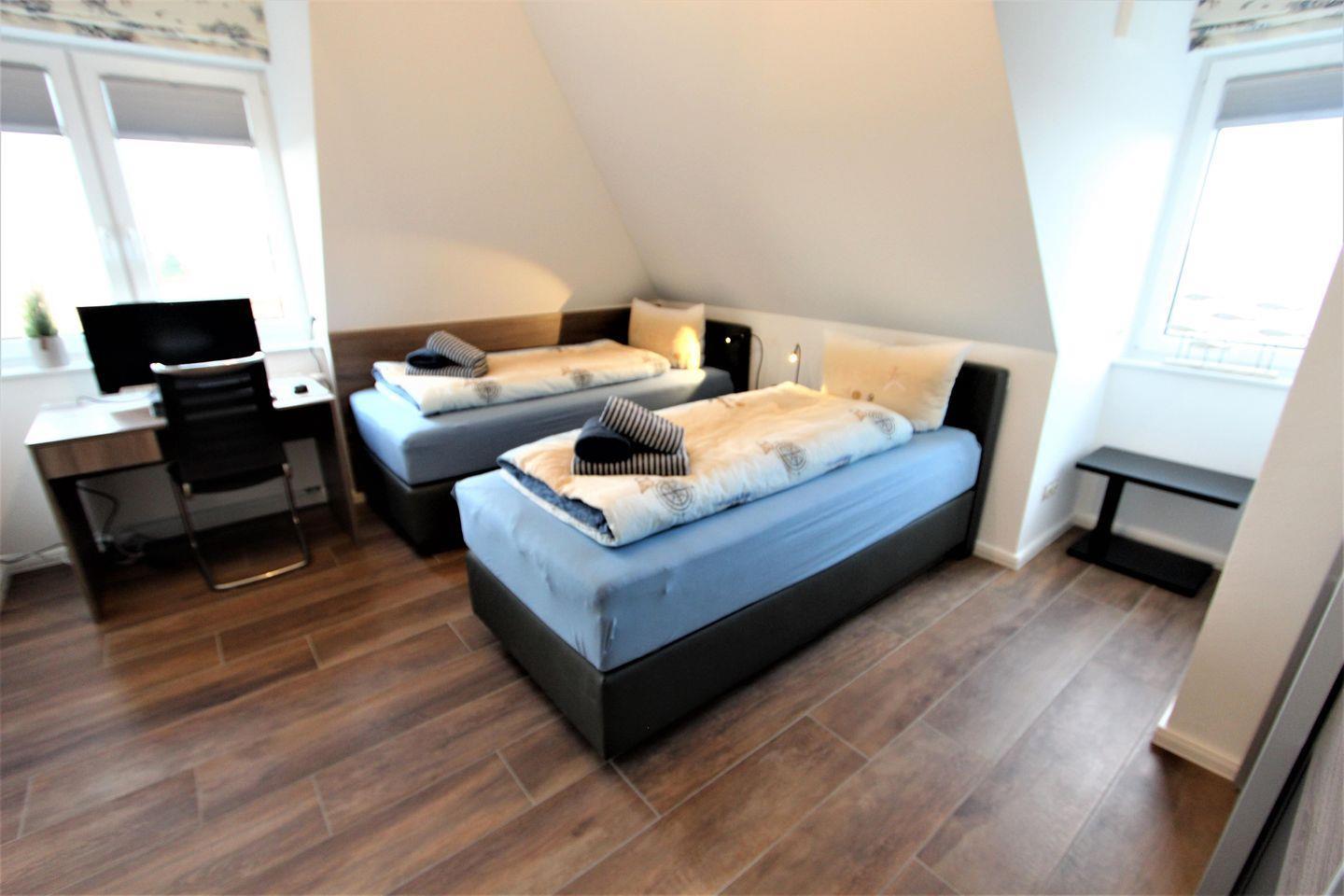 Das Hauptschlafzimmer ist mit einem Boxspringbett mit den Maßen 180 cm x 200 cm ausgestattet. Im 2. Schlafzimmer befinden sich 2 Einzelbetten mit den Maßen 90 cm x 200 cm (Einzelbetten können zusammengeschoben werden).