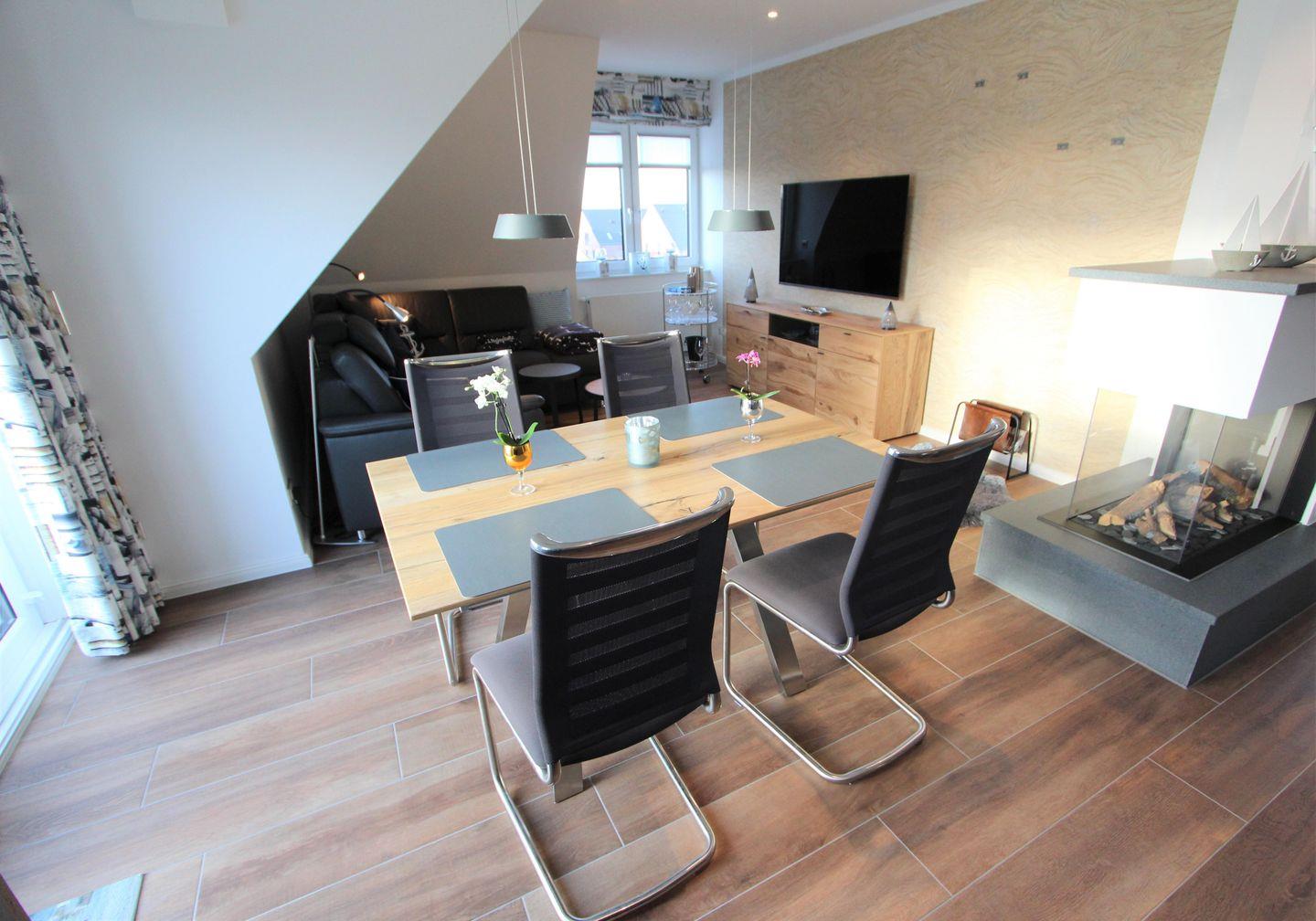 Modernes 5-Sterne-Penthouse auf Langeoog mit Balkon, Sauna und Gaskamin für entspannte Urlaubstage.