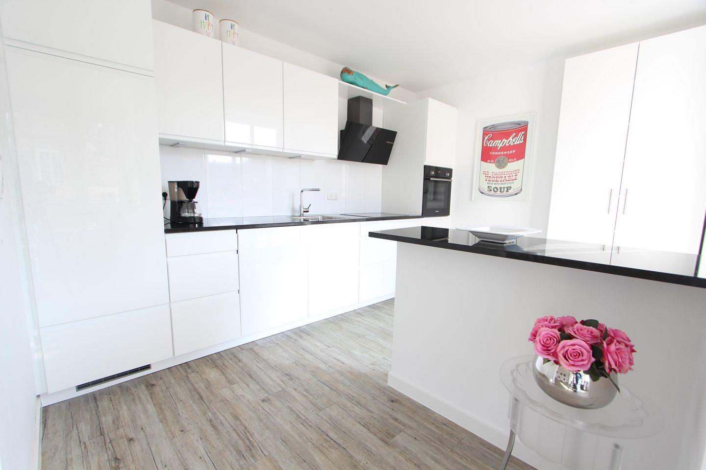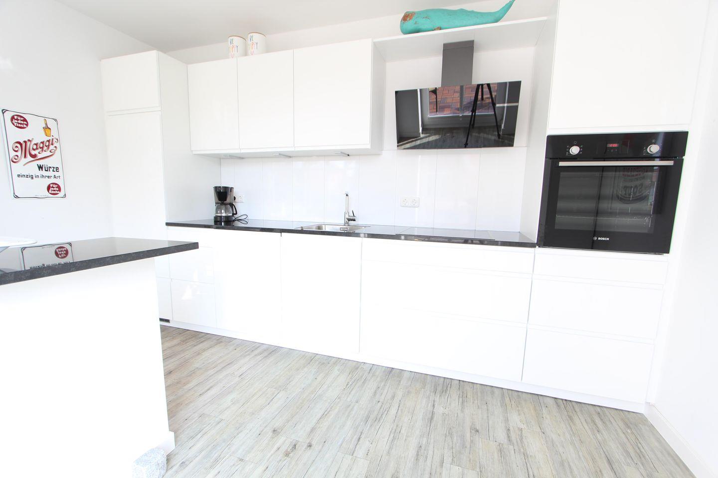 Wunderschöne, hochwertig ausgestattete Ferienwohnung in einem Neubau, ca. 80 m², mit Terrasse mit Strandkorb und Terrassenmöbeln, einem Wohnzimmer und Küche. Wohnzimmer mit Essgelegenheiten, bequemer Couch und Flachbildfernseher, komplett ausgestattete Einbauküche mit Cerankochfeld, Geschirrspülmaschine, Toaster, Kaffeemaschine und Wasserkocher. Ein Schlafzimmer (Doppelbett) mit Verdunkelungsrollos und zusätzlichem Fernseher, modernes Bad ensuite mit Dusche, Gästebad (WC mit Dusche), Waschmaschine im separaten Hauswirtschaftsraum, WLAN vorhanden.