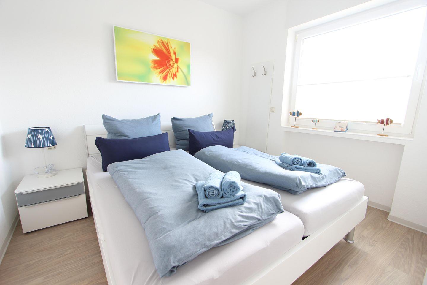 Ferienwohnung, für bis zu 4 Personen, ein Schlafzimmer mit einem Doppelbett, ein Zimmer mit einem Etagenbett, Südbalkon mit zwei Liegestühlen und einem Tisch