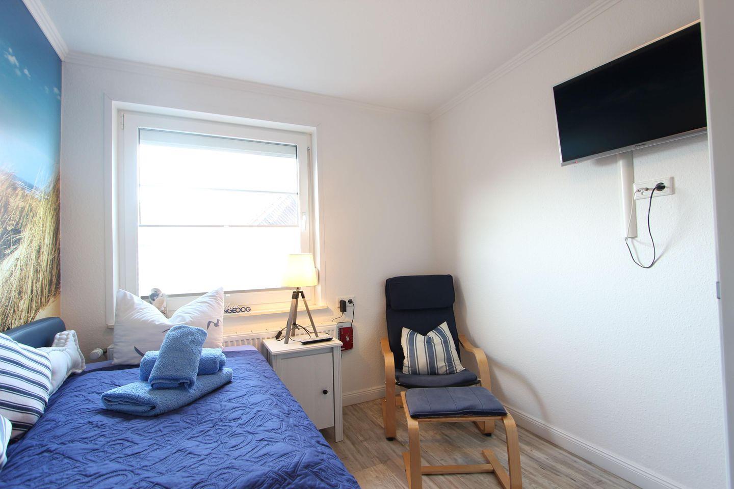 Schlafzimmer mit Boxspringbett (90 x 200 cm), TV.