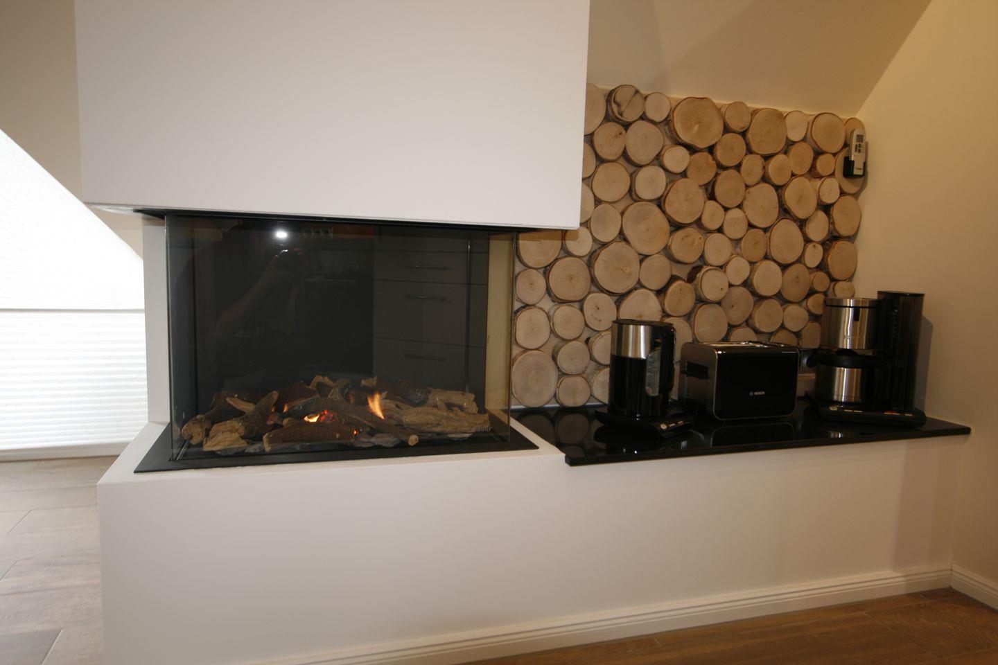 Hochwertige Ferienwohnung, 67 m², mit Balkon, Wohnküche mit Essgelegenheiten, mit tollem Gaskamin und bequemer Couch mit Flachbildfernseher, Einbauküche mit Cerankochfeld, Backofen und Geschirrspülmaschine, Kaffeemaschine und Wasserkocher