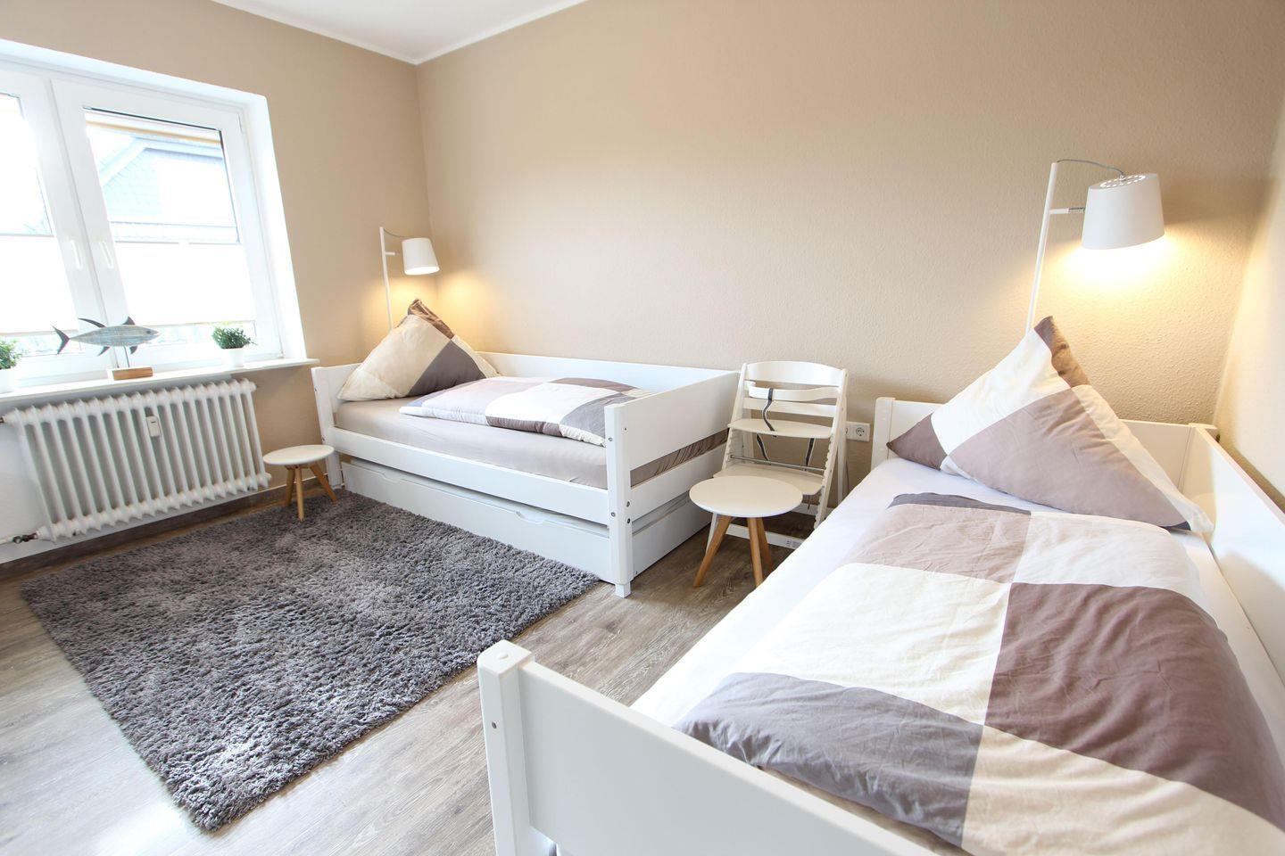 Im 2. Schlafzimmer befinden sich 2 Einzelbetten mit den Maßen 90 x 200 cm eines der Betten verfügt über einen Auszug für den 5. Schlafplatz. Hier befindet sich auch noch ein Schreibtisch mit PC-Monitor.