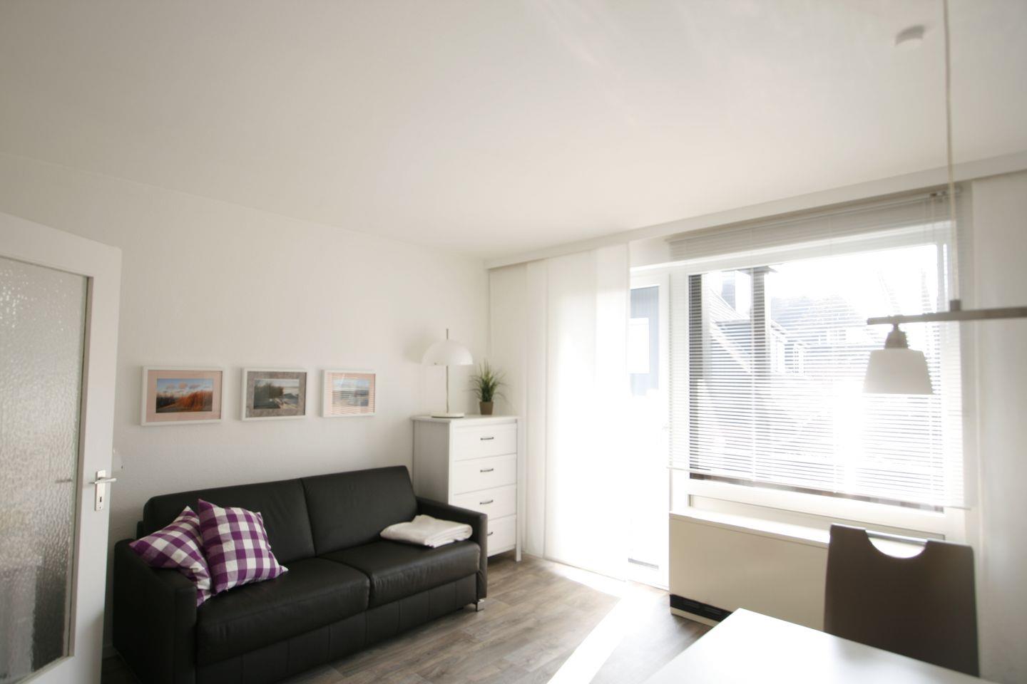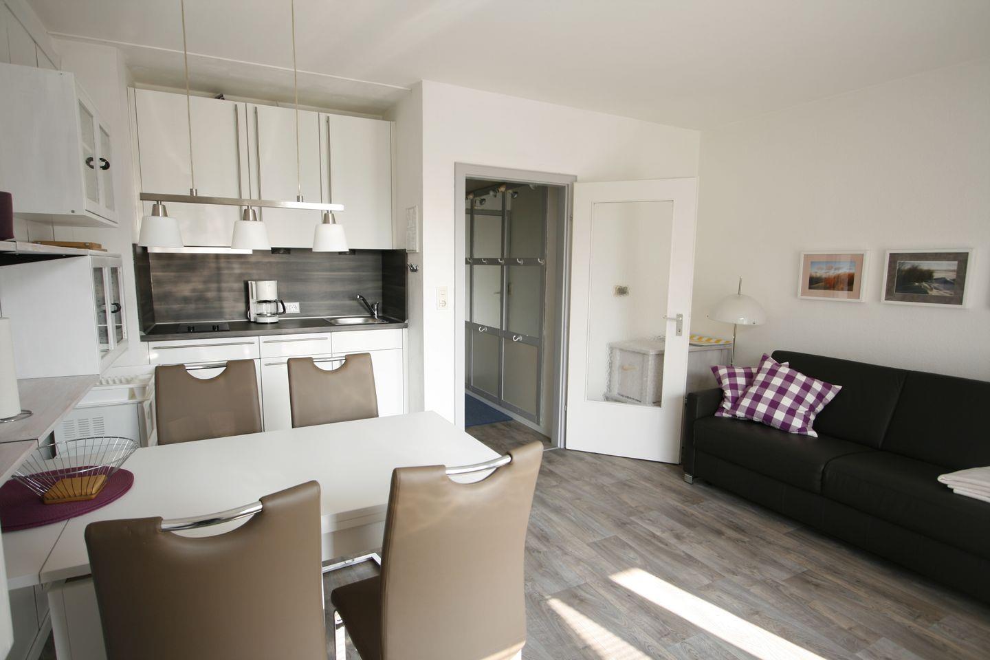 Wunderschöne, neu renovierte, hell ausgestattete Ferienwohnung mit Süd-Balkon. Nur 5 Gehminuten zum Strand und in den Ortskern. Ca.47 m² mit einer Wohnküche und Essgelegenheiten plus LED-Flachbildfernseher, komplett ausgestatteter Einbauküche mit Kochfeld, Mikrowelle und Geschirrspülmaschine, Toaster, Kaffeemaschine und Wasserkocher. Durch eine Wendeltreppe erreichen Sie einen großen Schlafraum mit einem Doppelbett sowie einem Etagenbett im Souterrain. Bad mit Dusche und WC befinden sich ebenfalls im Untergeschoss. Waschmaschine und Trockner befinden sich im Gemeinschaftskeller.
