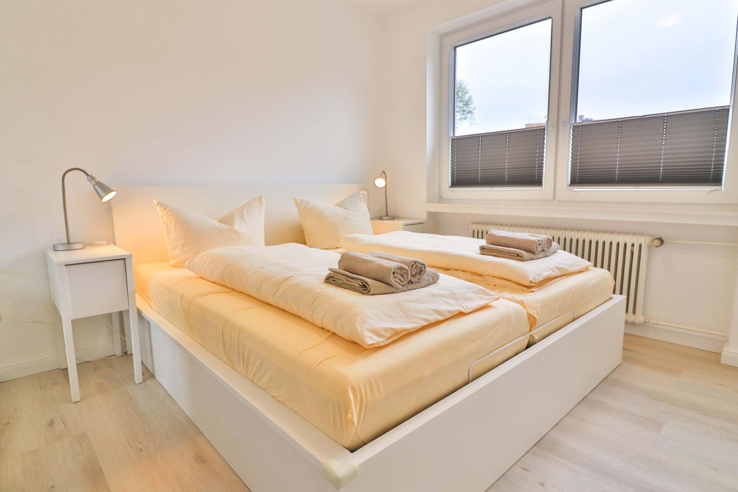 Das Hauptschlafzimmer mit einem komfortablen Doppelbett der Größe 180×200 cm, einem großen Kleiderschrank sowie einem offenen Wandregal für Ihre persönlichen Dinge bietet Ihnen entspannte Nächte. Das zweite Schlafzimmer ist mit zwei Einzelbetten der Größe 90×200 cm und 90x180 cm ausgestattet. Eine Kommode bietet in diesem Zimmer zusätzlichen Stauraum für Ihre Habseligkeiten.