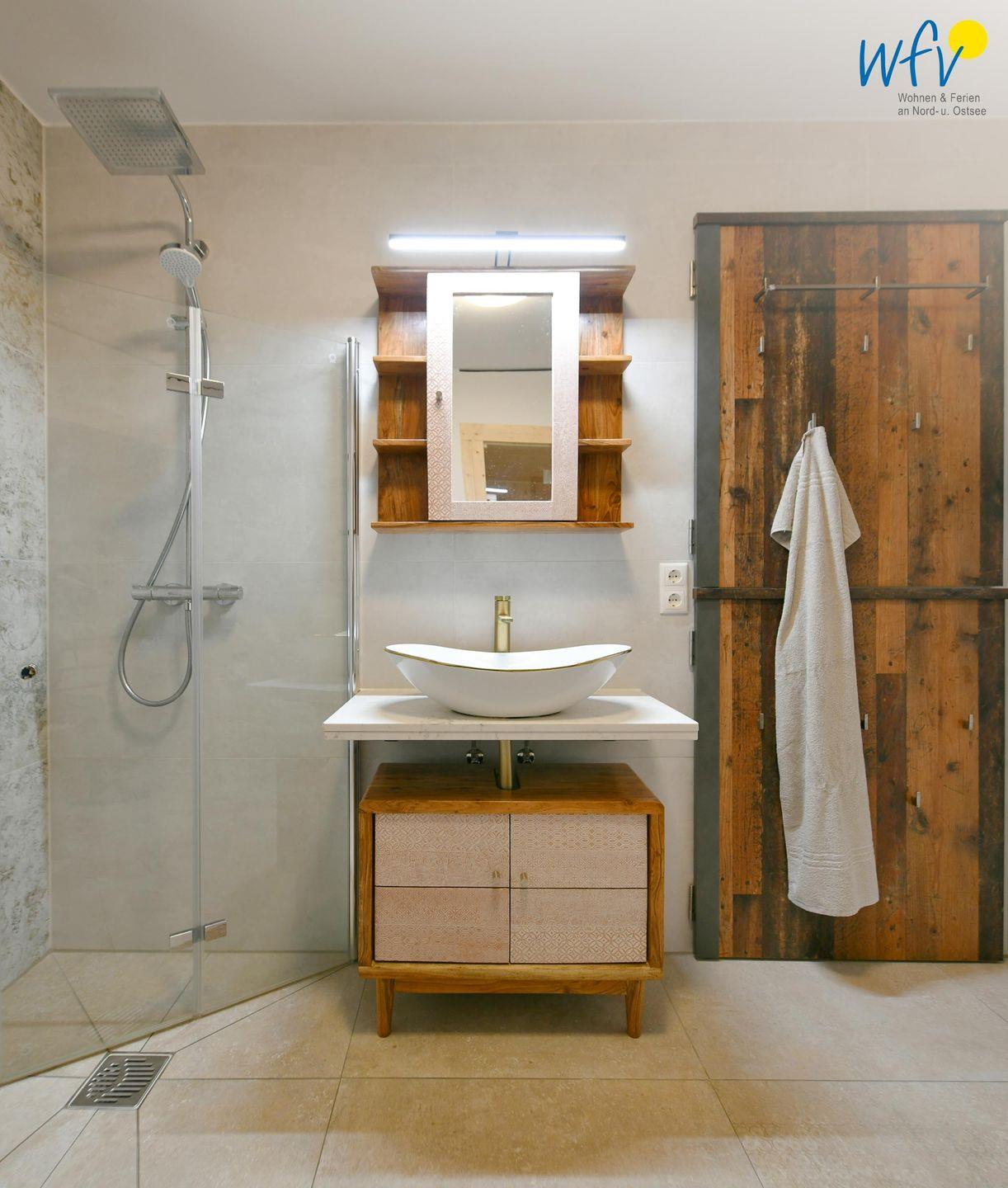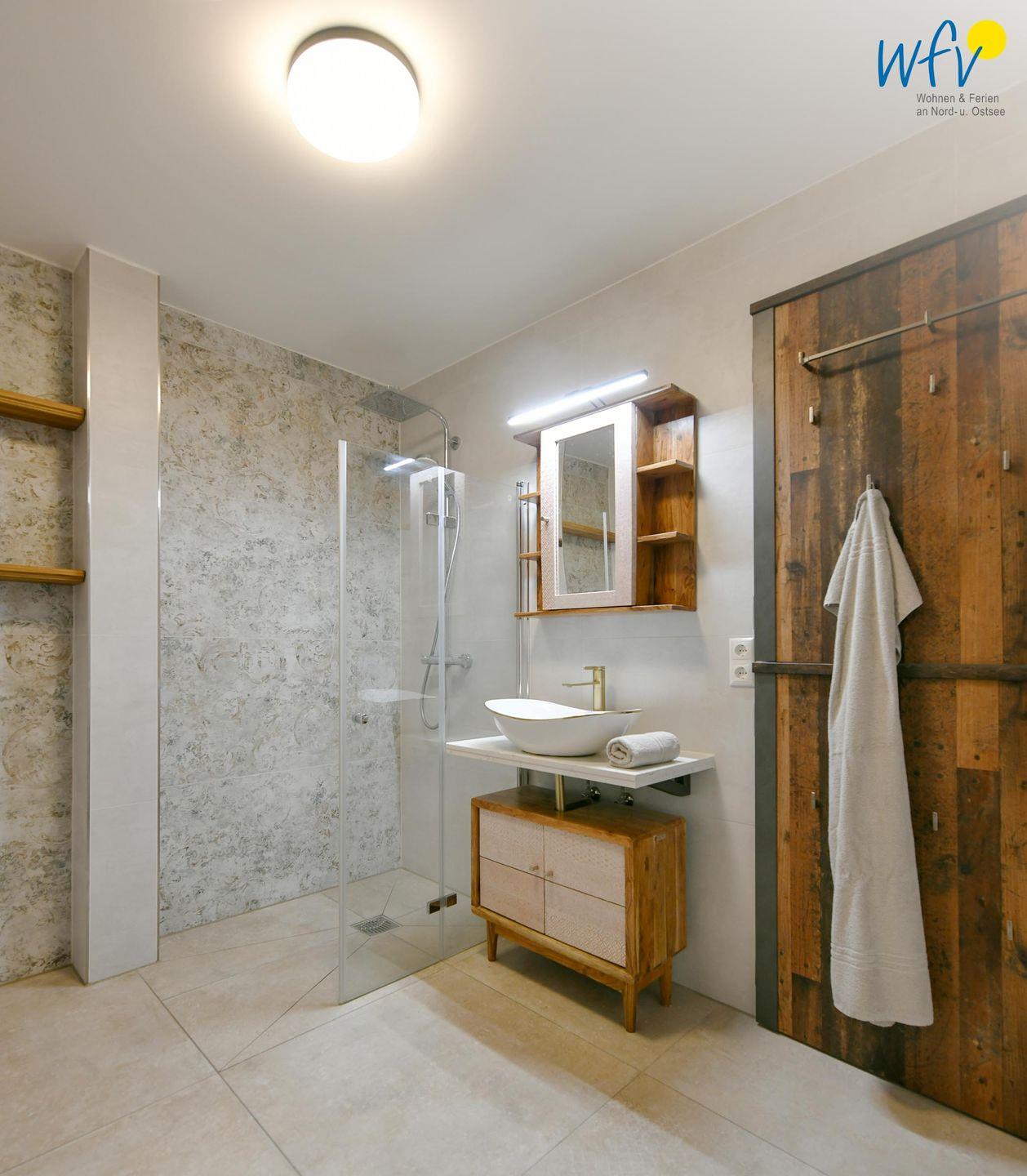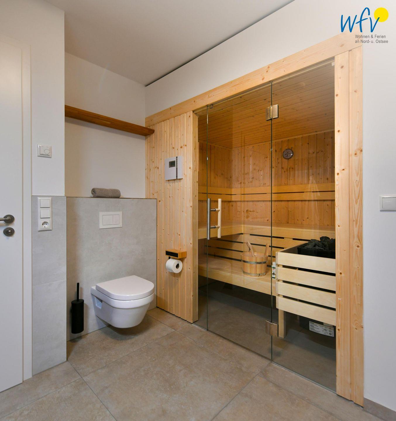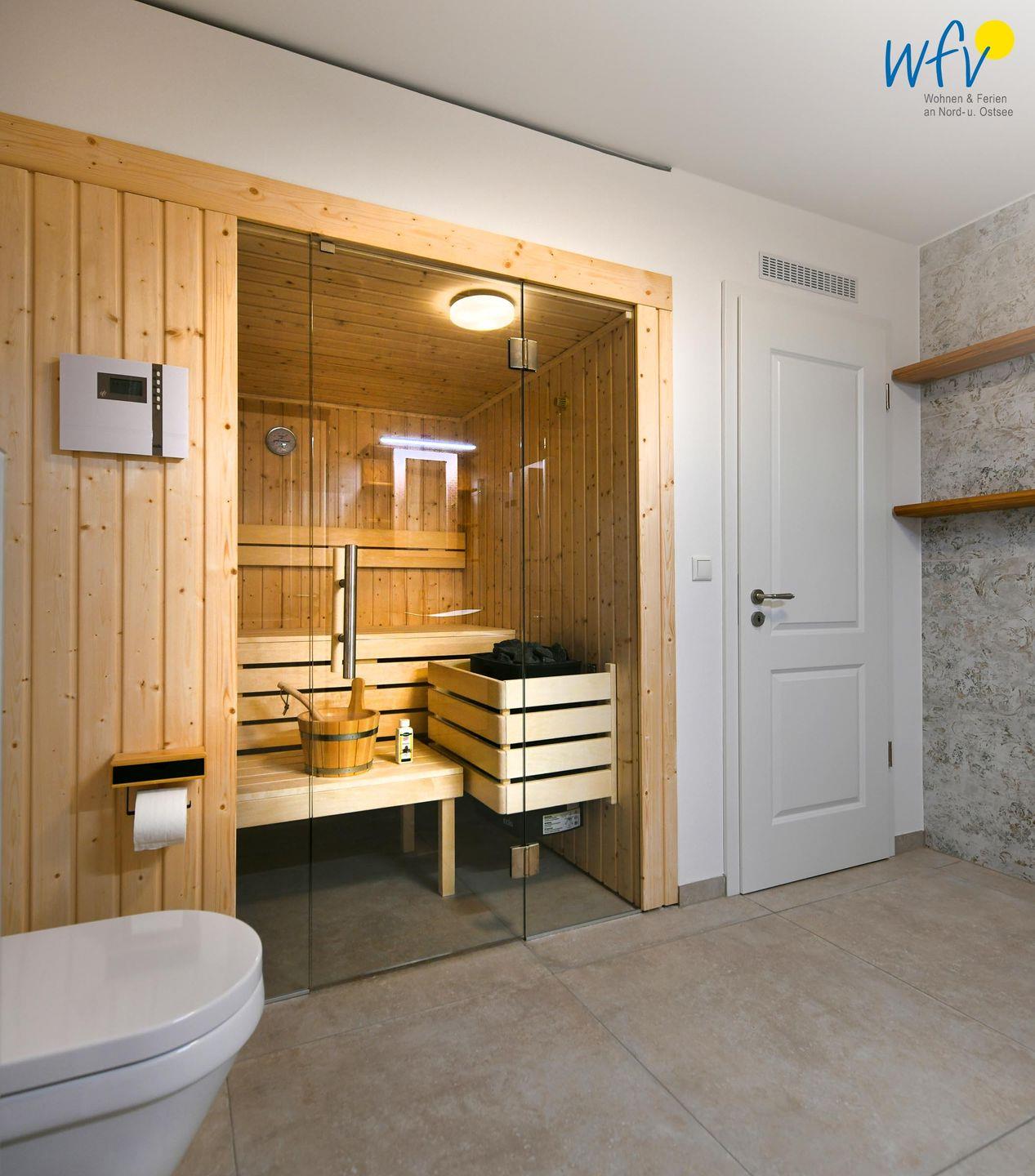Das elegante Badezimmer mit eigener Sauna und offenem Duschbereich sorgt für wohltuende Entspannungszeit.