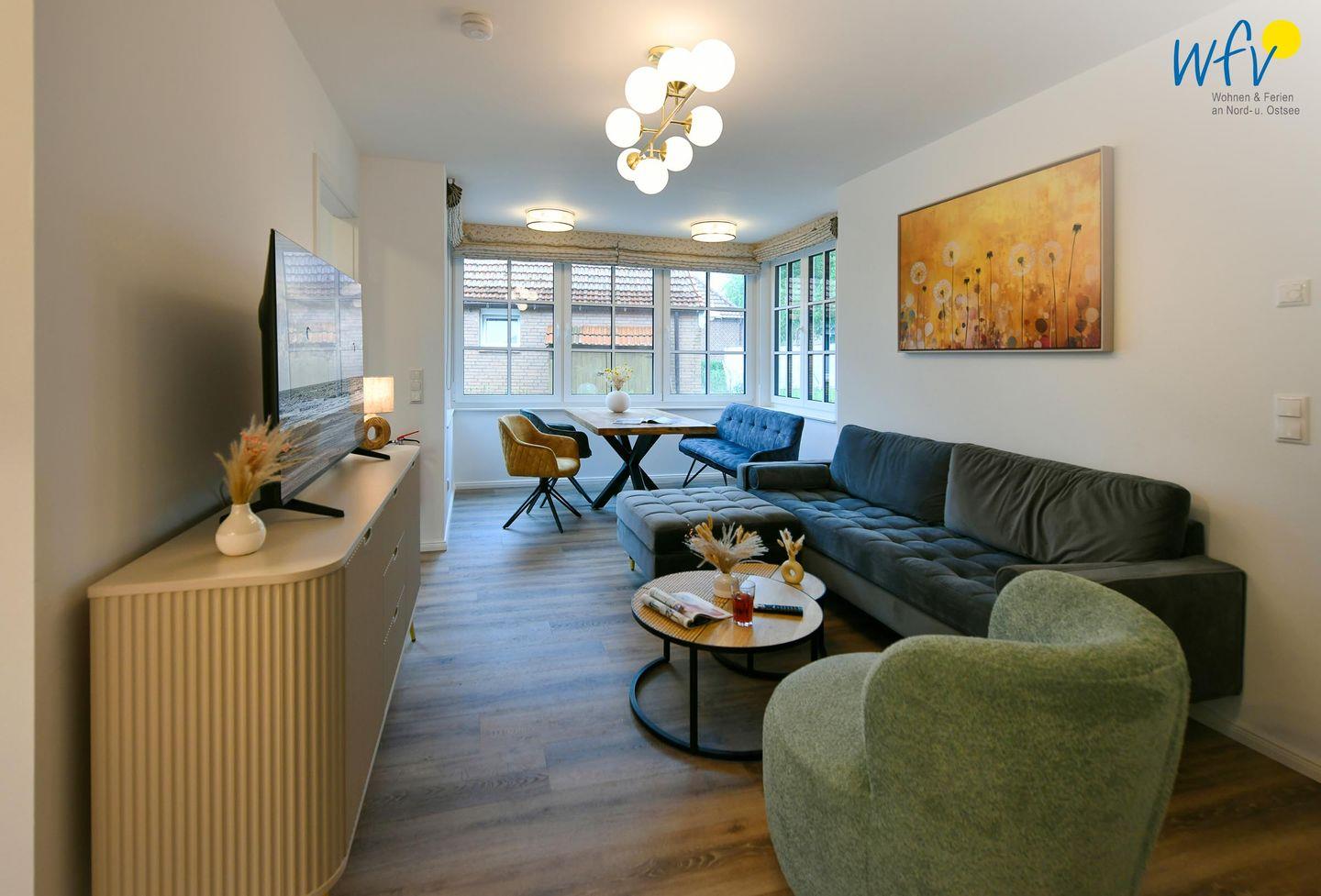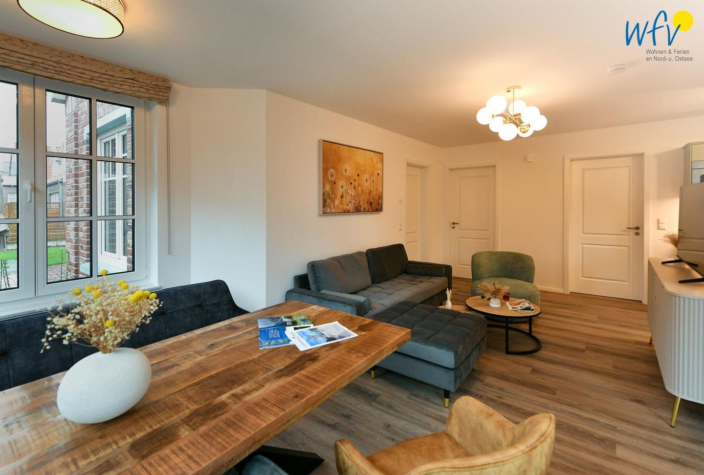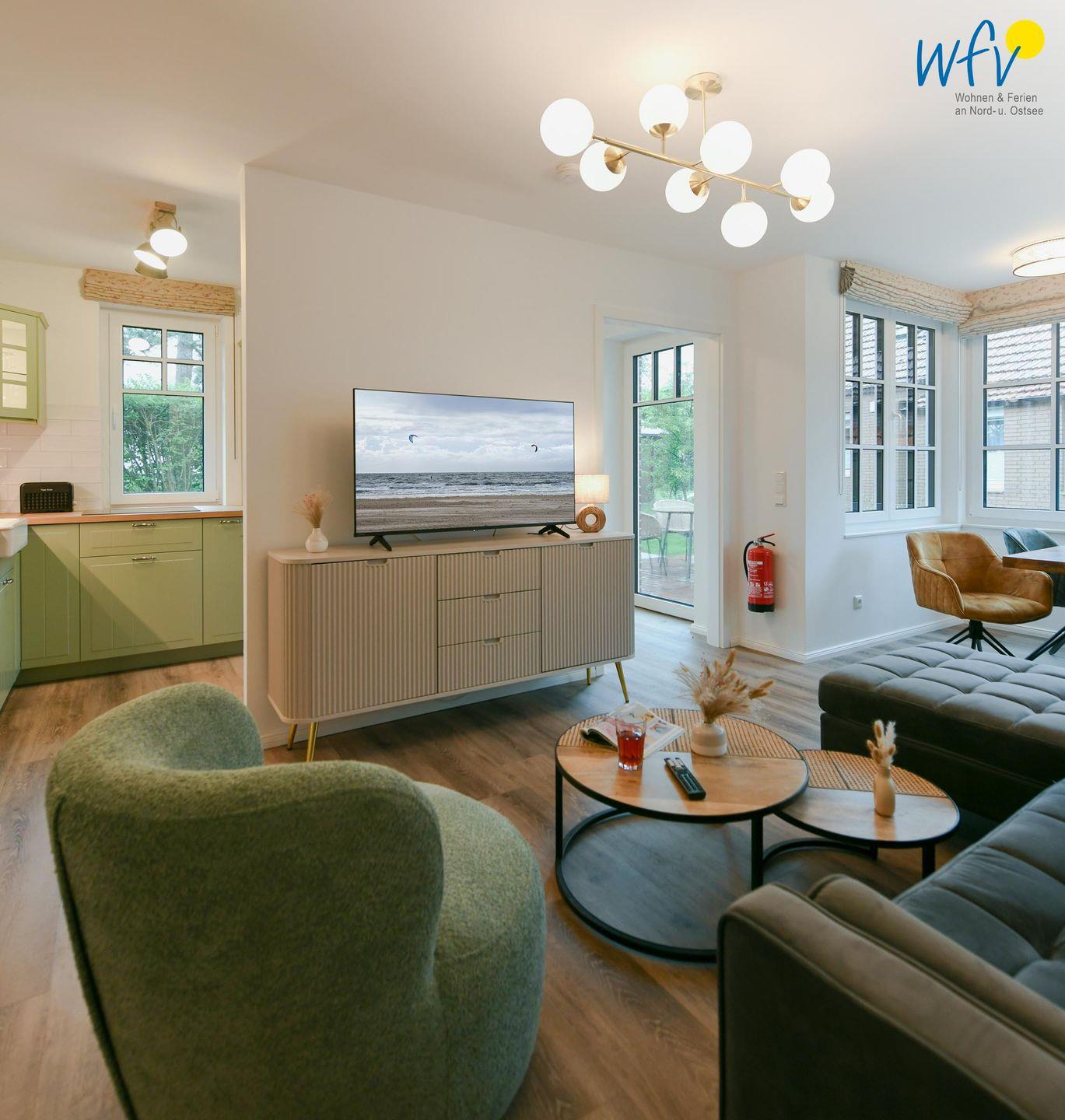Die Ferienwohnung verfügt über ein modernes, offenes Wohnkonzept, das für ein weites Raumgefühl sorgt. Wohnbereich und Küche sind harmonisch miteinander verbunden, sodass Sie hier nach dem Strandtag oder der Fahrradtour gemütliche Abende auf dem bequemen Sofa verbringen, fernsehen und lesen können oder das gemeinsame Kochen genießen. Für kulinarische Erlebnisse ist die moderne Küche mit einem 4-Platten-Induktionsherd, einem Backofen, einer Mikrowelle, einem Kühlschrank sowie einer Spülmaschine ausgestattet. Der Essbereich mit breiter Fensterfront und schönem Lichteinfall lädt zu entspannten Mahlzeiten ein.