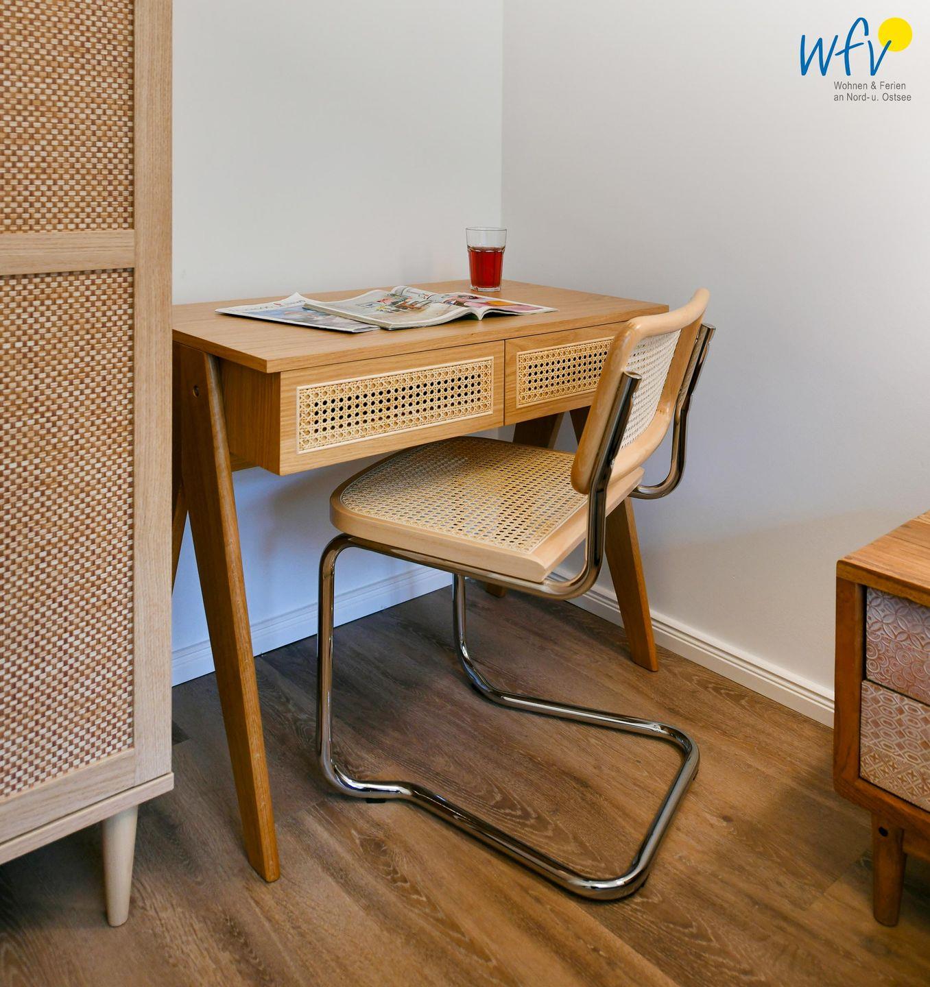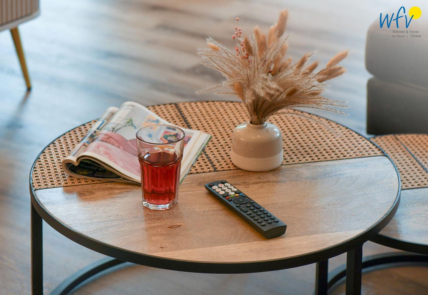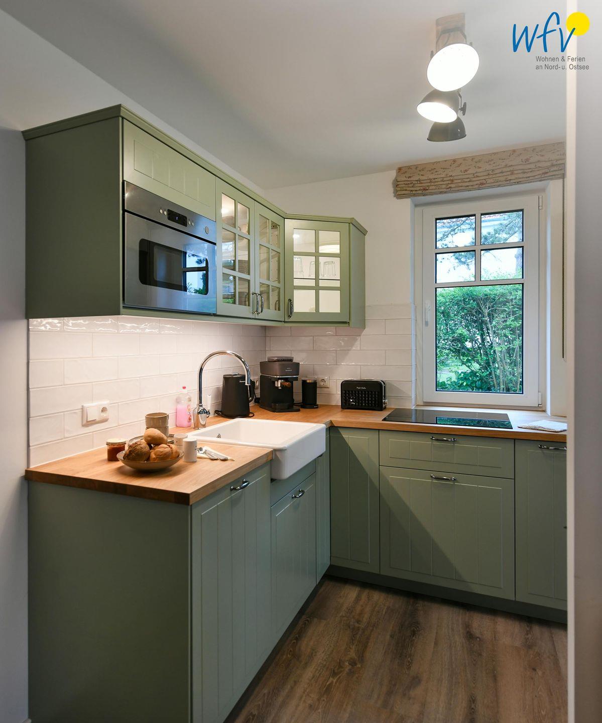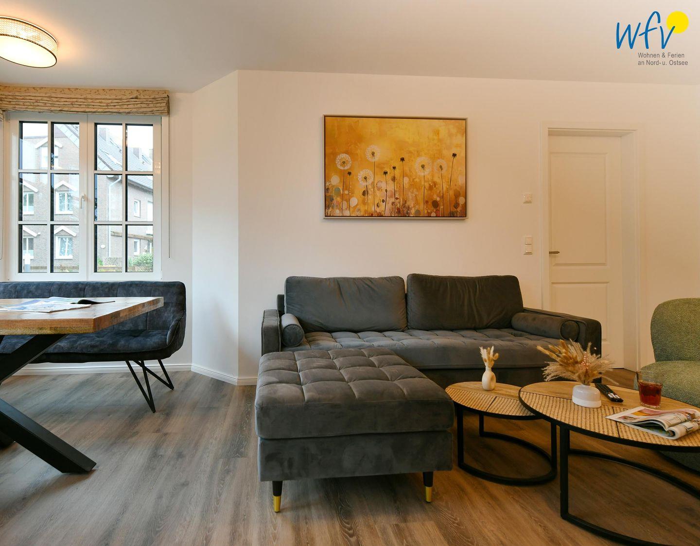 Die Ferienwohnung verfügt über ein modernes, offenes Wohnkonzept, das für ein weites Raumgefühl sorgt. Wohnbereich und Küche sind harmonisch miteinander verbunden, sodass Sie hier nach dem Strandtag oder der Fahrradtour gemütliche Abende auf dem bequemen Sofa verbringen, fernsehen und lesen können oder das gemeinsame Kochen genießen. Für kulinarische Erlebnisse ist die moderne Küche mit einem 4-Platten-Induktionsherd, einem Backofen, einer Mikrowelle, einem Kühlschrank sowie einer Spülmaschine ausgestattet. Der Essbereich mit breiter Fensterfront und schönem Lichteinfall lädt zu entspannten Mahlzeiten ein.